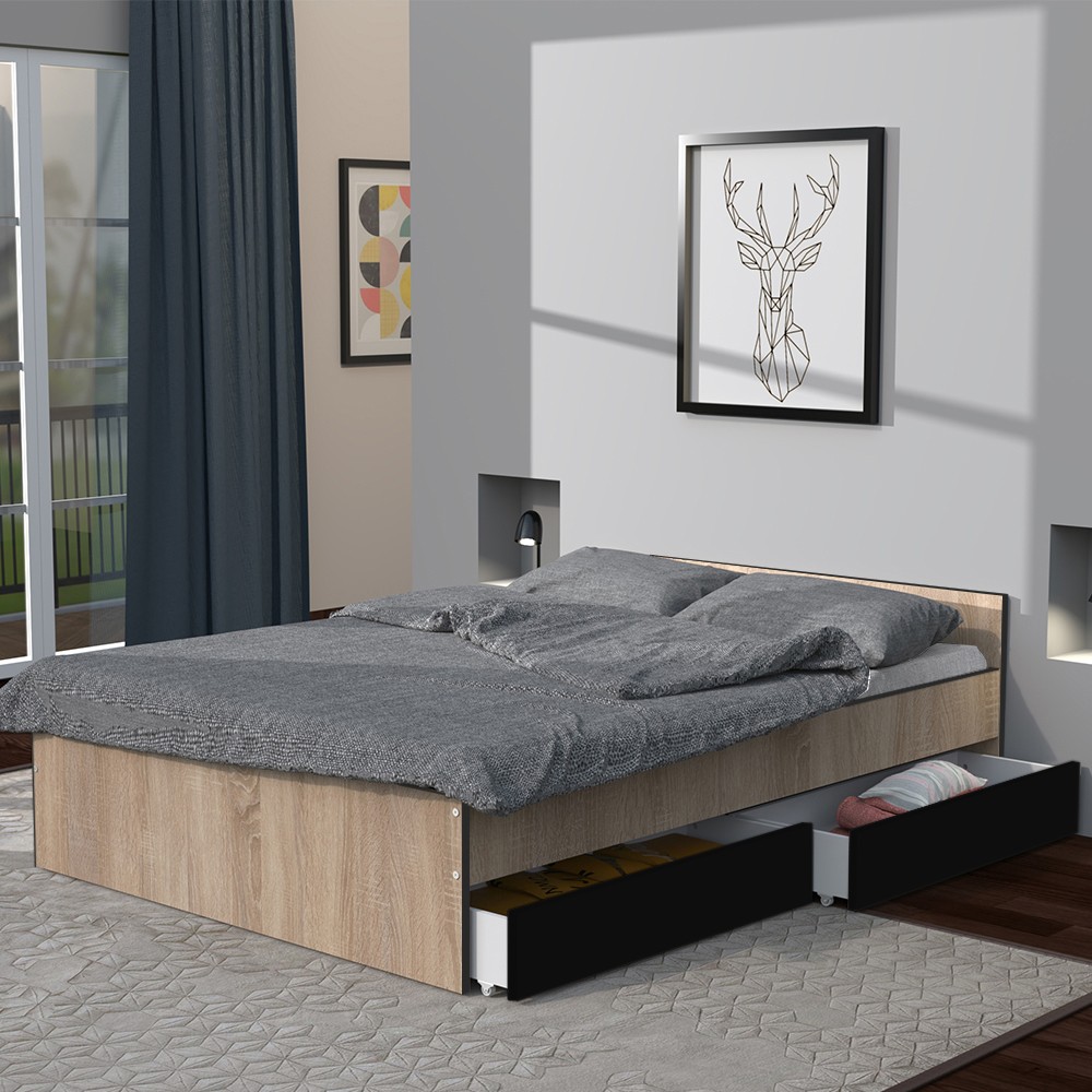 Lit KAPPA 140x190 cm + 2 tiroirs / Décor chêne Blanchi et Noir