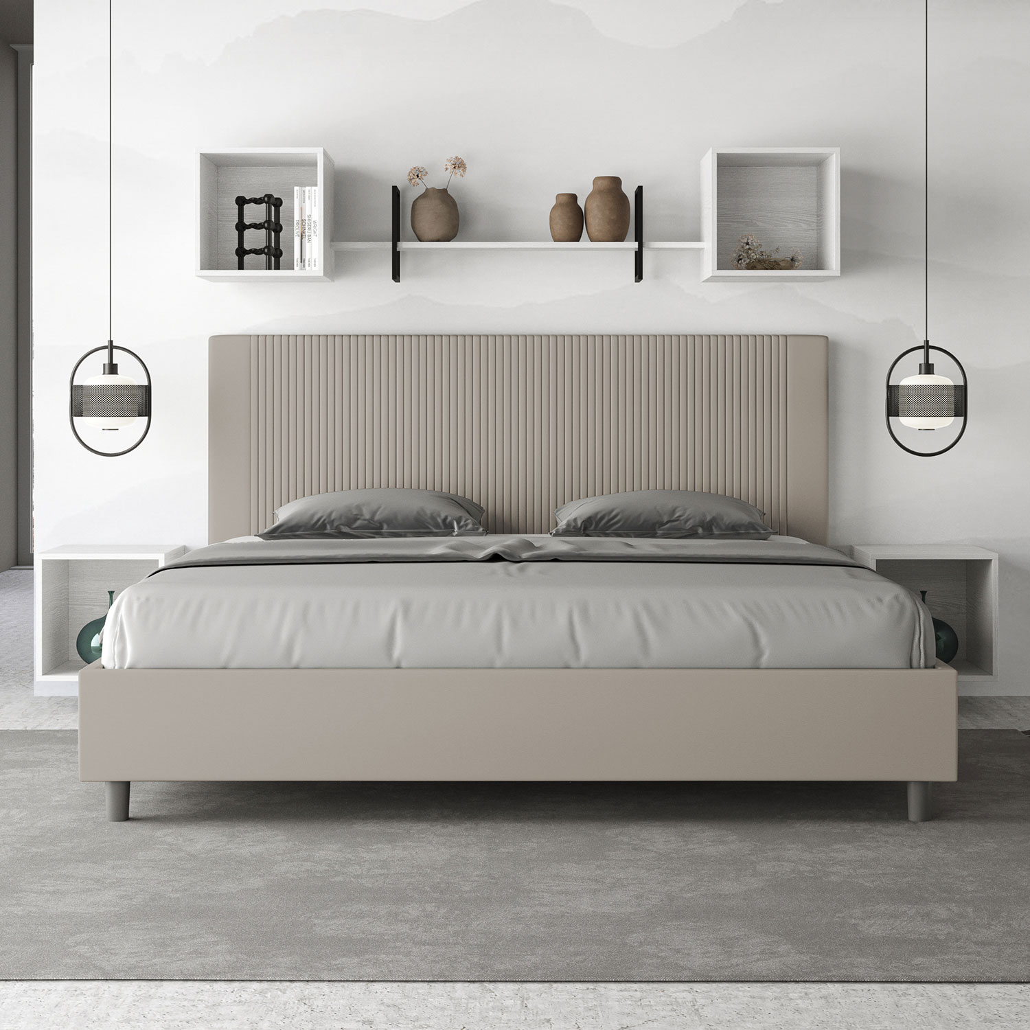 Lit 180x190Goya avec tête de lit et cadre de lit rembourrés, revêtement en PU, particulièrement polyvalent et facile à assortir à tout style de décoration. Le lit 180x190Goya est caractérisé par un style moderne et élégant, mis en valeur par la tête de lit matelassée revêtue en PU. La présence du PU, en plus de donner à la pièce une atmosphère chaleureuse et accueillante, offre la commodité d'un nettoyage facile et rapide, grâce à l'utilisation d'un simple chiffon en microfibre. Lit fourni avec un sommier à lattes, prévu pour un matelas de 180x190 cm - Matelas non inclus. Revêtement de lit non déhoussable. Produit Ityhome Made in Italy Dimensions: L.195 P.210 H.122 cm Hauteur pieds: 12 cm Hauteur du cadre de lit: 27 cm Hauteur du sommier depuis le sol: 38 cm