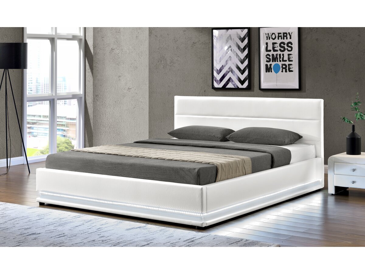 Lit avec LED "Anastasia"Un lit design et solideLe lit 2 places Anastasia est doté d'un design à la fois moderne et sobre.Enveloppé de lin, sa structure est un savant mélange de MDF et de contreplaqué, pour un lit véritablement robuste et stable.Le lit Anastasia est également pourvu d'une tête de lit stylisée.Elle sert autant à apporter un charme indéniable à une chambre et à lui donner plus de caractère, qu'à vous proposer un support dorsal confortable pour lire un bon bouquin ou pour regarder un film avant d'aller dormir. Personnalisez votre chambreDe plus en plus demandé, le lit à éclairage LED est devenu très populaire.Son subtil éclairage permet de créer une ambiance personnalisée dans sa chambre à coucher.Selon vos goûts, ce lit LED peut vous être utile si vous avez besoin d'une légère veilleuse, d'un éclairage tamisé ou si vous vous sentez d'humeur festive.L'éclairage LED est d'une teinte blanche/bleutée. Pensez pratiqueLe lit double Anastasia dispose d'un coffre de rangement et vous apprécierez très vite cet espace supplémentaire dans votre chambre. Le fond du coffre se compose d'une toile fixée par du Velcro.Grâce à sa grande taille, le coffre de rangement de ce lit vous permet d'y ranger tout ce dont vous avez besoin, notamment en literie. Lit avec LED "Anastasia" - Blanc - Dimensions matelas : 160 x 200 cm - Dimensions lit : 171 x 213 x 90.5 cm - MDF + Bois + PVC - Tête de lit fournie - Coffre de rangement - Avec sommier à lattes - Matelas en option .Descriptif: Lit 2 places