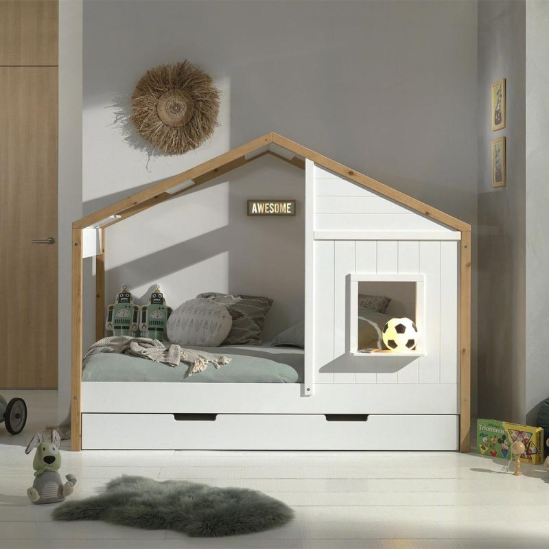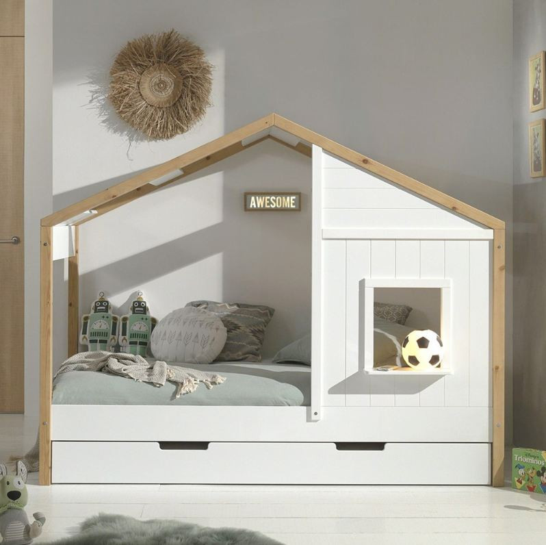 Lit maisonnette gigogne 90x200 1 fenêtre bois clair et blanc Babs
