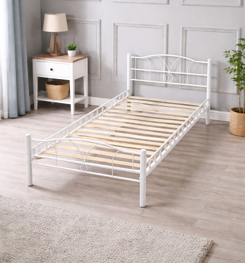 * Cadre de Lit Simple en Metal. Caracteristiques: 1. Lit simple solide en metal, avec des lignes epurees, ce cadre de lit sera un ajout apprecie aux chambres et au salon, egalement ideal pour les petits espaces, les enfants, les adolescent, les invites et les adultes.2. Un sommier integre, avec une tete de lit, un pied de lit et Lattes en Metal renforce . 3. Design moderne, minimaliste et intemporel, resistant aux chocs et aux rayures epaisseur du Metal +/- 0,75 mm . revetement anti-rayures blanc. 4. Livraison rapide. 5. Extremement solides - Adapte aux collectivites Dortoirs Camping Hotel Gites. S'il vous plait noter:* Le matelas n'est pas inclus. * Ne serrez pas les vis jusqu'a ce qu'elles soient completement assemblees.* Ne Pas utiliser ce produit si des pieces sont manquantes, endommagees ou usees. * Ne Pas permettre aux enfants de sauter sur le lit, car cela pourrait causer des dommages au chassis.* Veuillez verifier et serrer toutes les vis et boulons vers le haut tous les 3 mois pour assurer la stabilite.