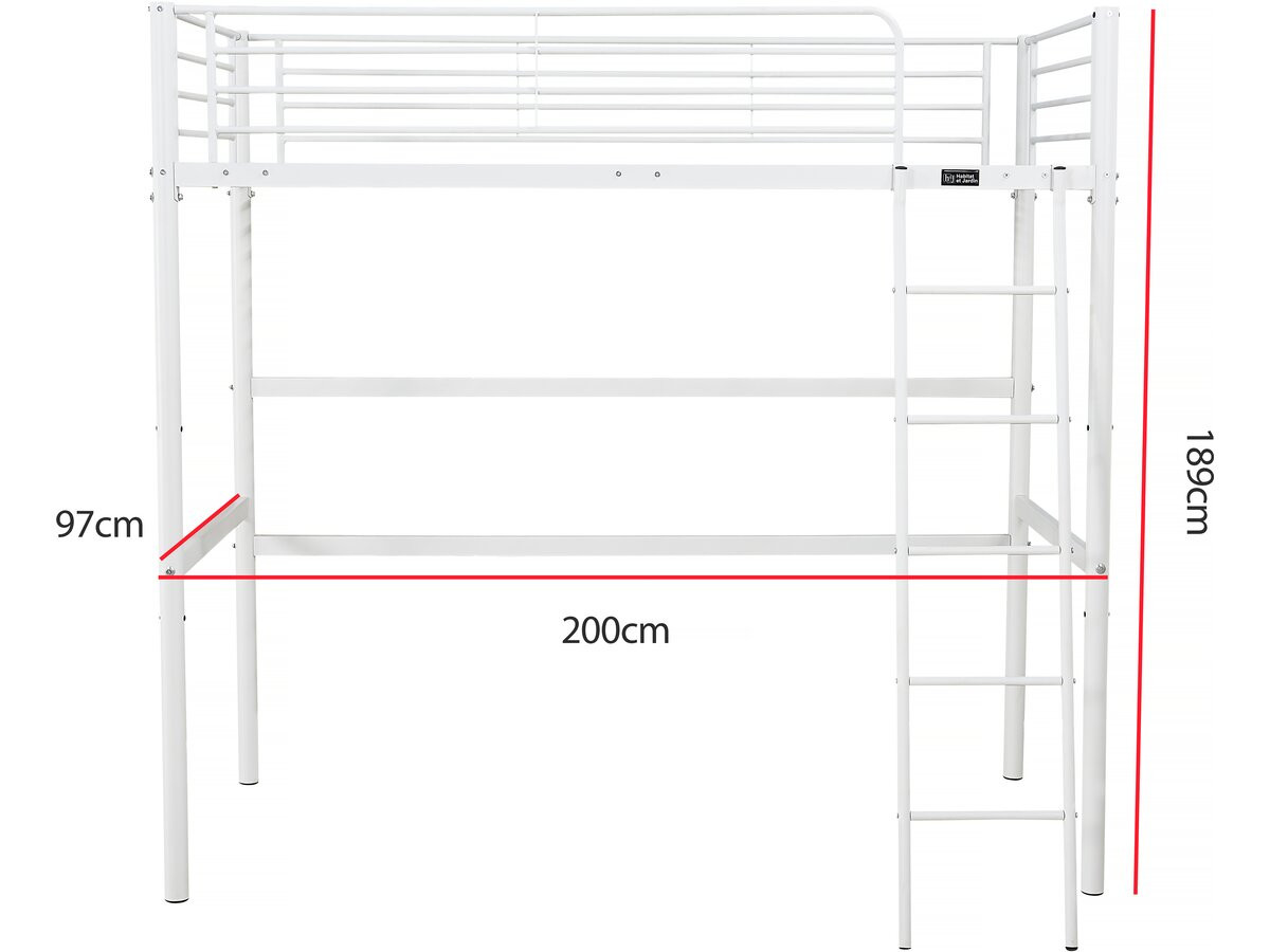 Descriptif: 24 Lattes en métal inclues - Dimensions des lattes : 1.6 x 1.6 x 2.2 Echelle en acier 5 marches inclues Barrière de sécurité - Dimensions barrière de sécurité : 150 x 1.9 x 32 cm Dimensions de l'échelle : 159 x 36.5 x 2.2 Taille recommandé pour le matelas : 90 x 190 cm Hauteur de couchage : 152 cm