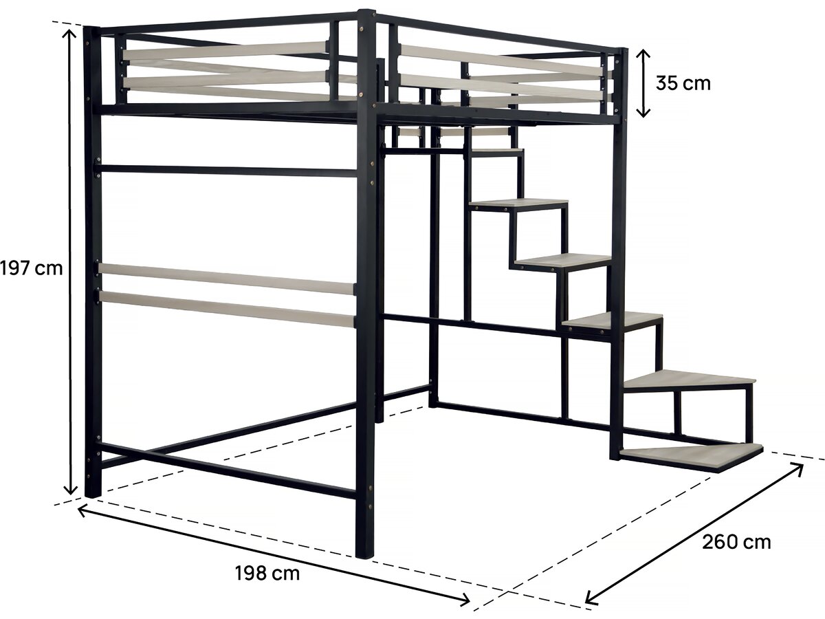 Descriptif:Lit mezzanine 140 x 200 cm avec escalier noir. .Matière:Métal.Couleur ( filtre):Noir.Taille (filtre):140 x 200 cm.Matière (filtre):Acier.Coloris:Noir.Dimensions :252 x 151,5 x 196 cm.Lattes:144 x 1,5 x 1,5 cm.Longueur:260 cm.Hauteur:197 cm.Largeur:198 cm.Dimension Pieds:182 x 20 x 32 cm.Hauteur de couchage:162 cm.Poids:75.5 kg.Poids maximum supporté:300 kg.Le + produit:Gain d'espace Accessibilité facile au lit grace a l'escalier Escalier reversible .Colisage:2 colis : - 2,02 x 0,385 x 0,16 m, 38 kg - 1,52 x 0,525 x 0,14 m, 32,1 kg.