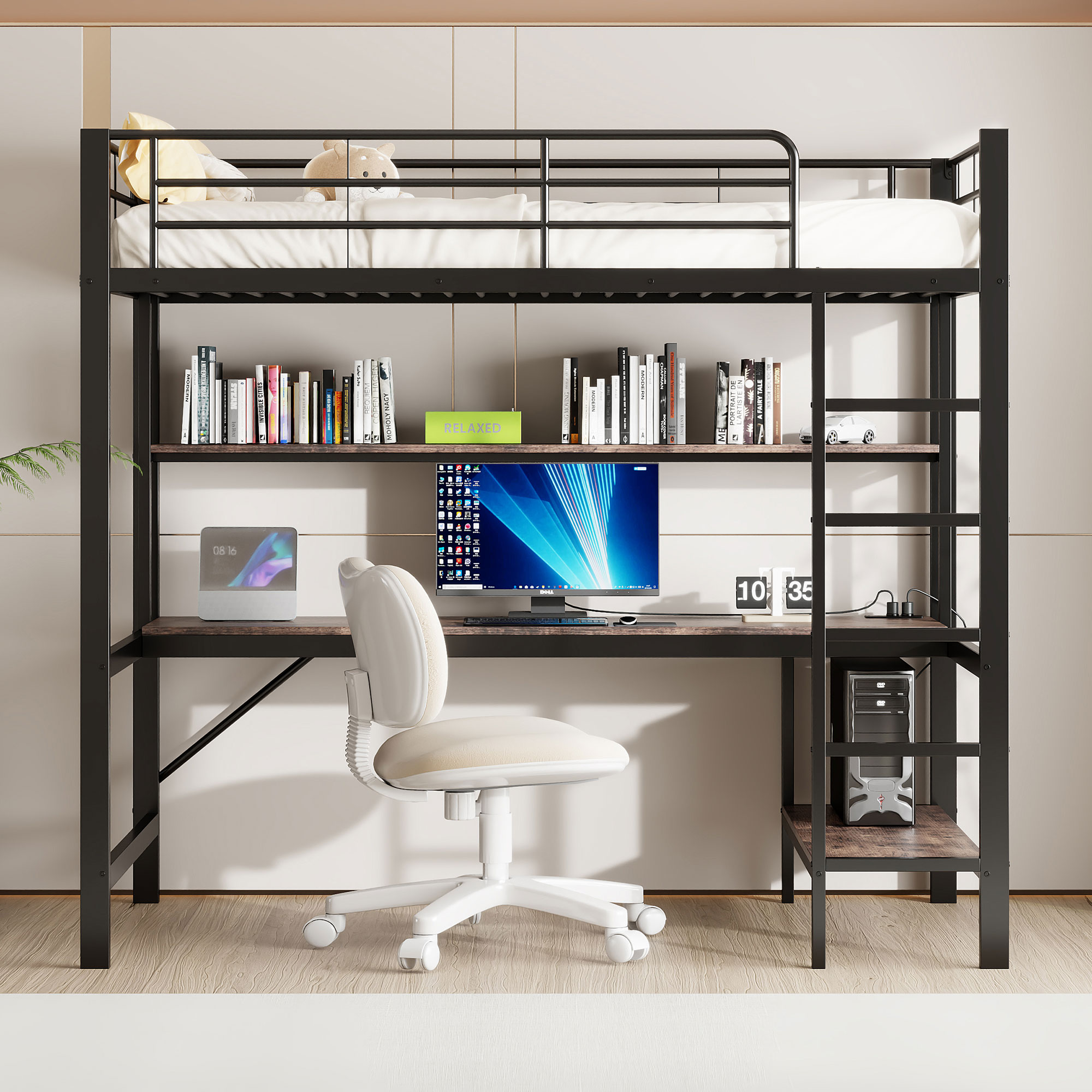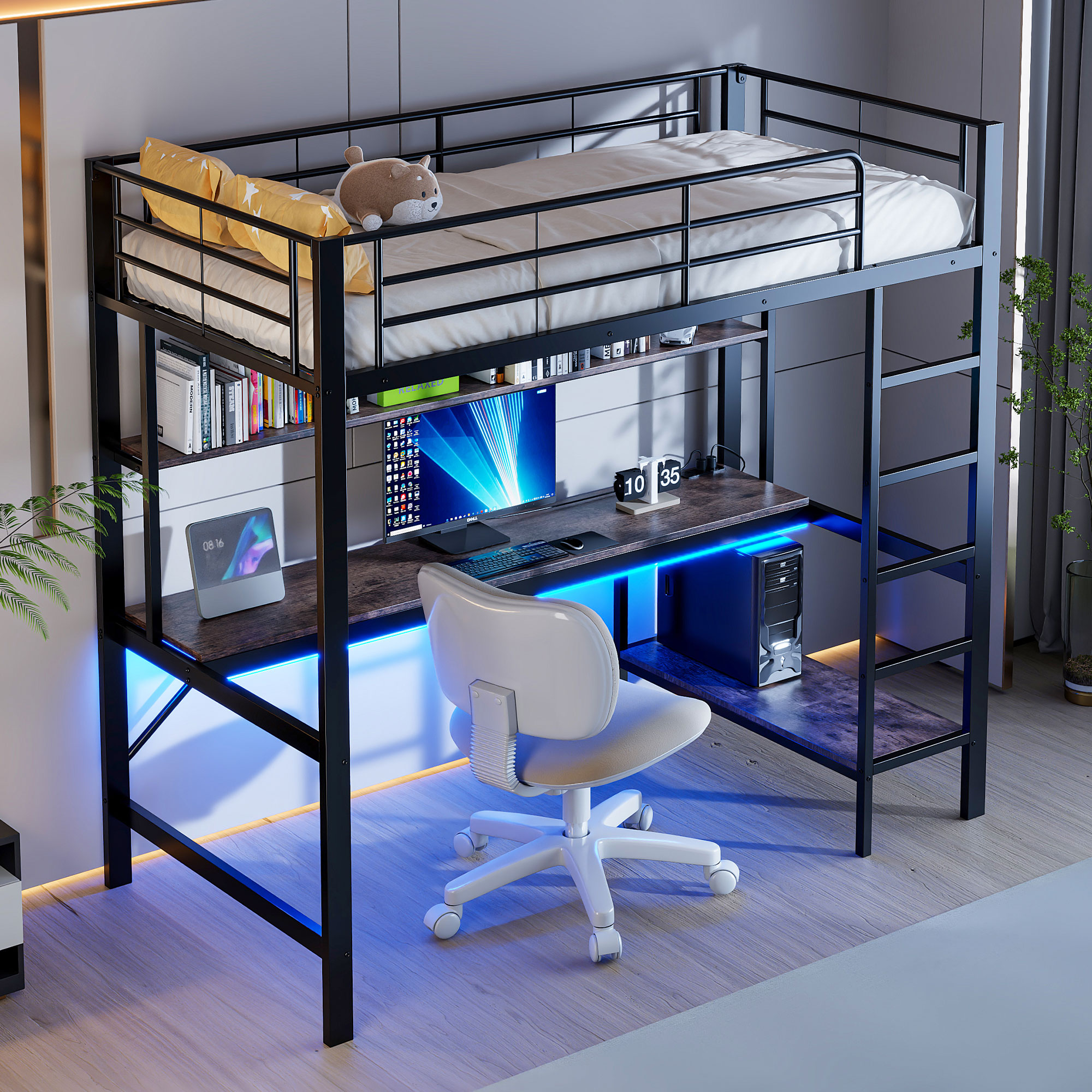 Lit Mezzanine Simple 90x200cm, avec LED + Prises + USB + Bureau + Étagères, Lit Enfant, Métal, Noir