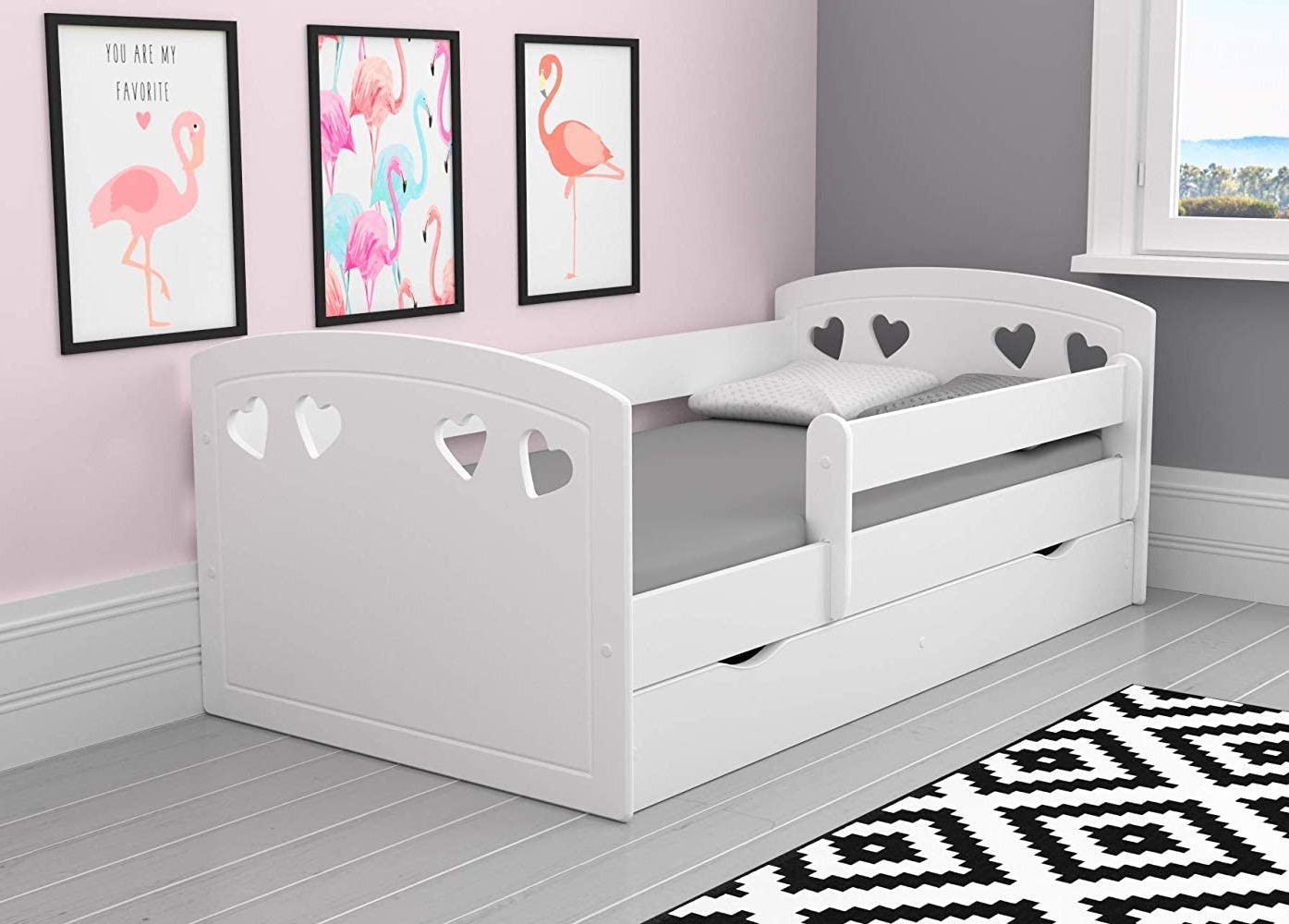 Lit orné de cœurs avec barrière de sécurité amovible blanc Myra-80x180-Tiroirs Avec tiroir
