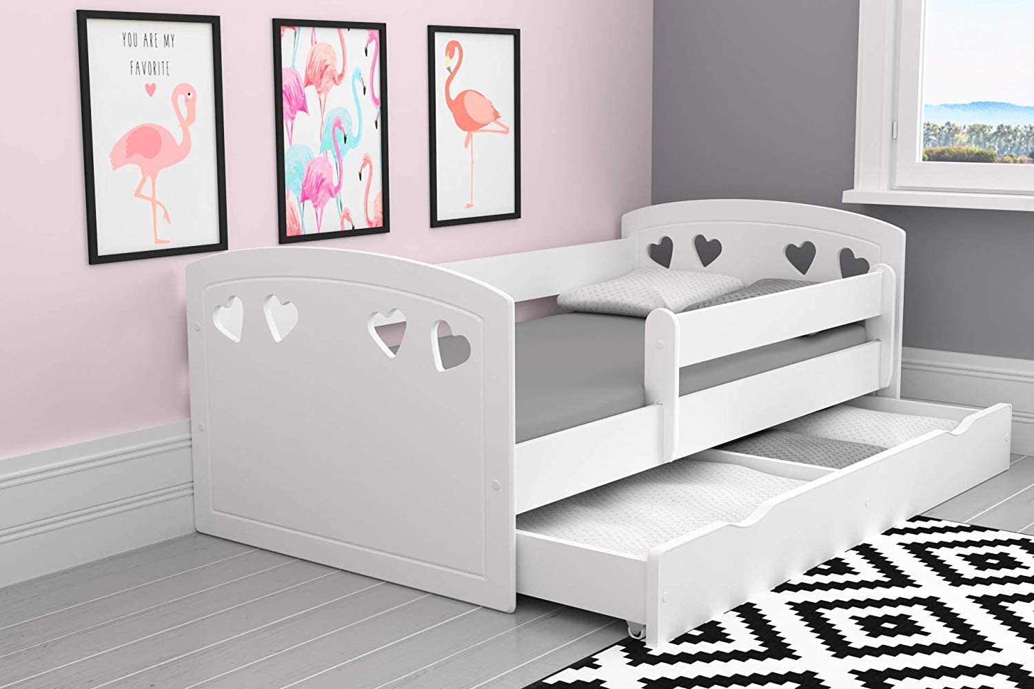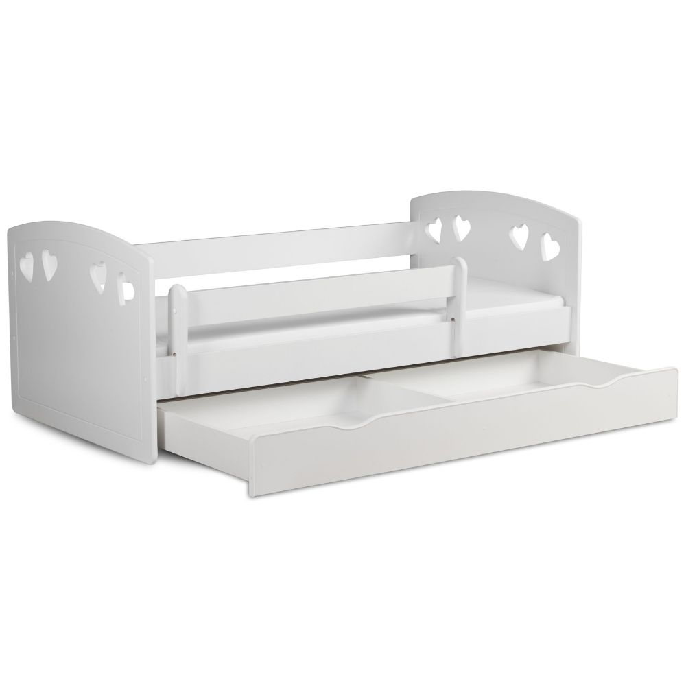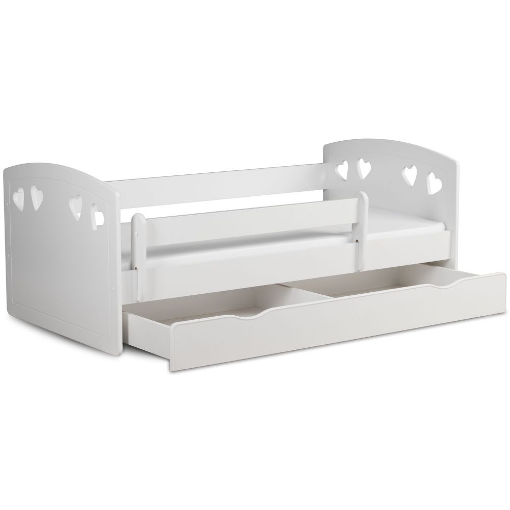 | Libellé | Lit orné de cœurs avec barrière de sécurité amovible blanc Myra-80x180-Tiroirs Avec tiroir |