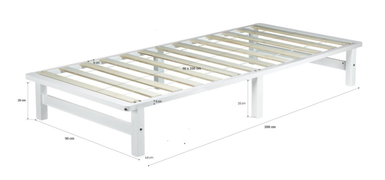 Matière et couleur : Cadre de lit en bois de pin massif Peint en blanc Dimensions : Surface de couchage du lit (L x P) : 90 x 200 cm Dimensions du lit (L x P) : 90 x 200 cm Bord supérieur du chevet : 28 cm Hauteur de rangement sous le lit : 25 cm pas de profondeur d'insertion, le matelas peut être placé directement sur le dessus Épaisseur du matériau : 30 mm Épaisseur du poteau : 4,8 cm étendue de la livraison : Cadre de lit avec sommier à lattes, notice de montage La décoration et le matelas ne sont pas inclus La livraison s'effectue par service de colis Condition de livraison : emballé démonté, assemblage requis livraison par service de colis