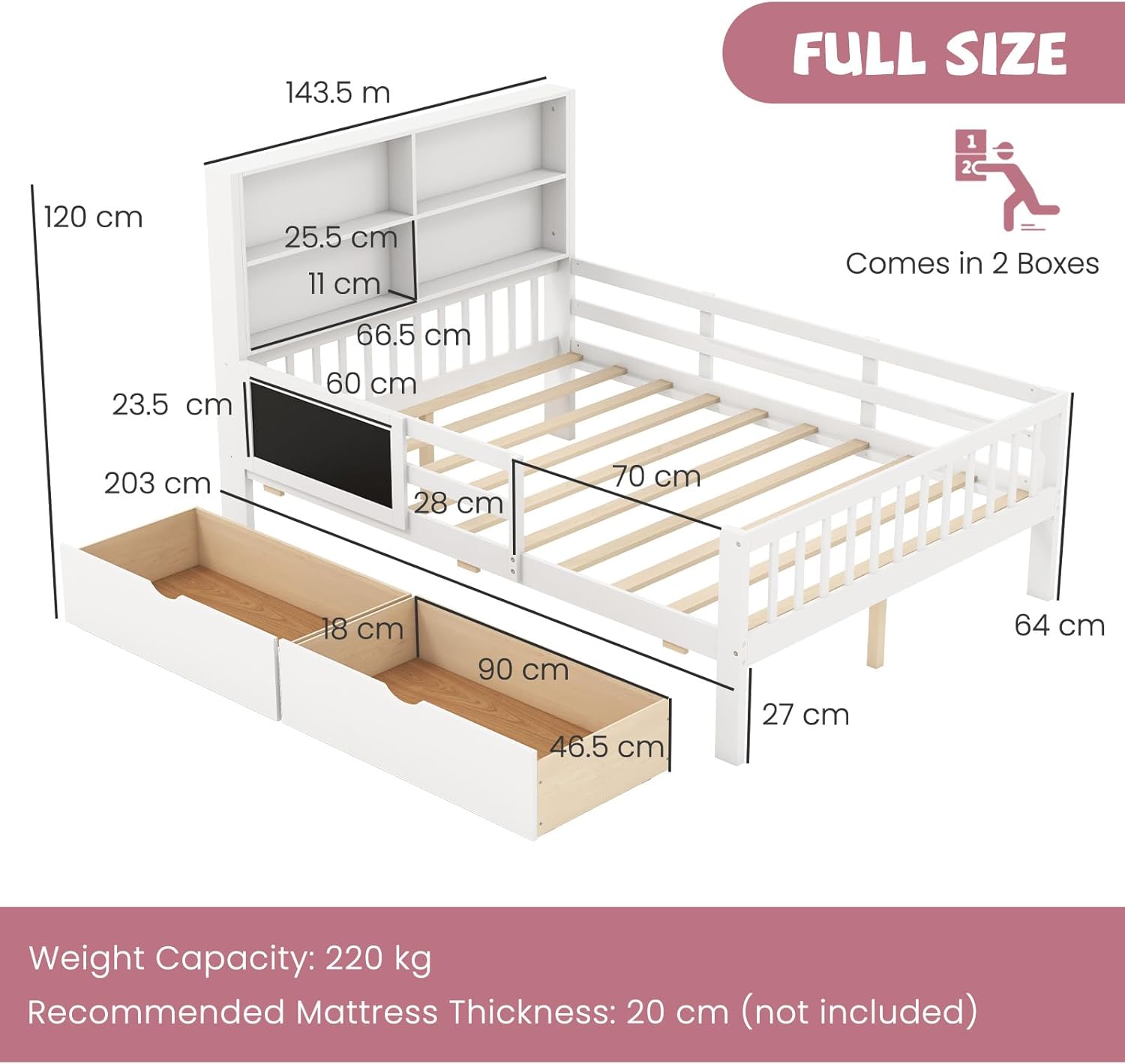 Libérez la créativité de votre enfant avec ce cadre de lit pour enfant doté d'un tableau intégré qui transforme l'heure du coucher en une aventure amusante et éducative. Il est parfait pour gribouiller, écrire et jouer avec imagination et éveiller la créativité. Ce lit d'enfant est également livré avec 2 tiroirs pratiques et une étagère de rangement pour garder la chambre organisée. Ce cadre de lit en pin massif de haute qualité est durable et stable. Les 10 lattes en contreplaqué robustes offrent un excellent soutien du matelas sans lit à sommier tapissier. La sécurité est primordiale, et les garde-corps de protection continus de 28 cm de haut offrent une protection. Avec son design élégant et moderne, ce lit double convient aux garçons et aux filles et complète facilement n'importe quel décor de chambre.
