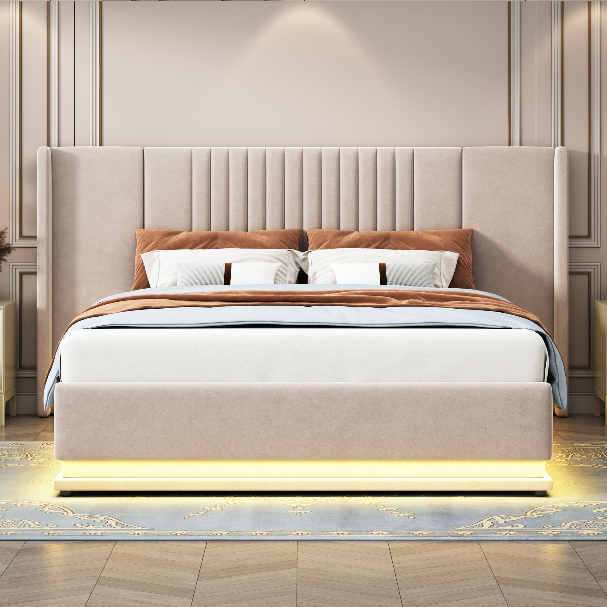 Lit rembourré 140 x 200 cm, avec banquette escamotable, éclairage LED, lit plat double, beige, tissu velo