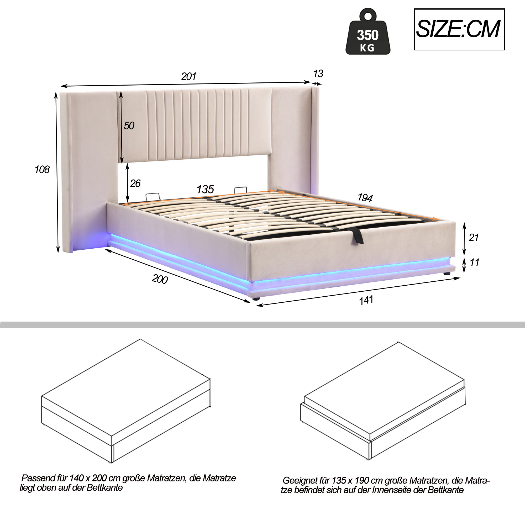 【Dimensions】: dimensions: 210 x 151 x 105 (L x L x H). Convient pour un matelas de 140 x 200 (matelas non inclus). Capacité de charge: 250 kg.