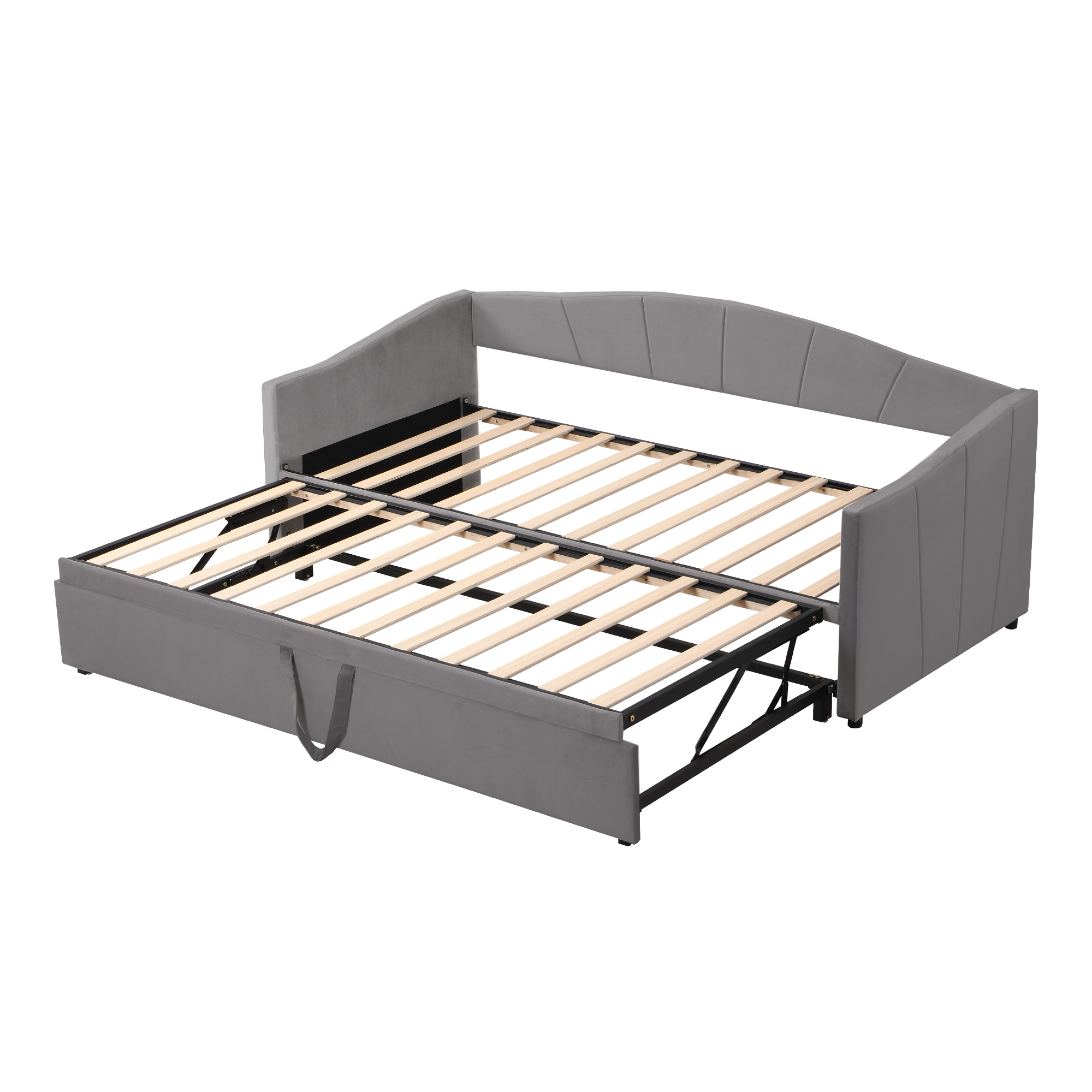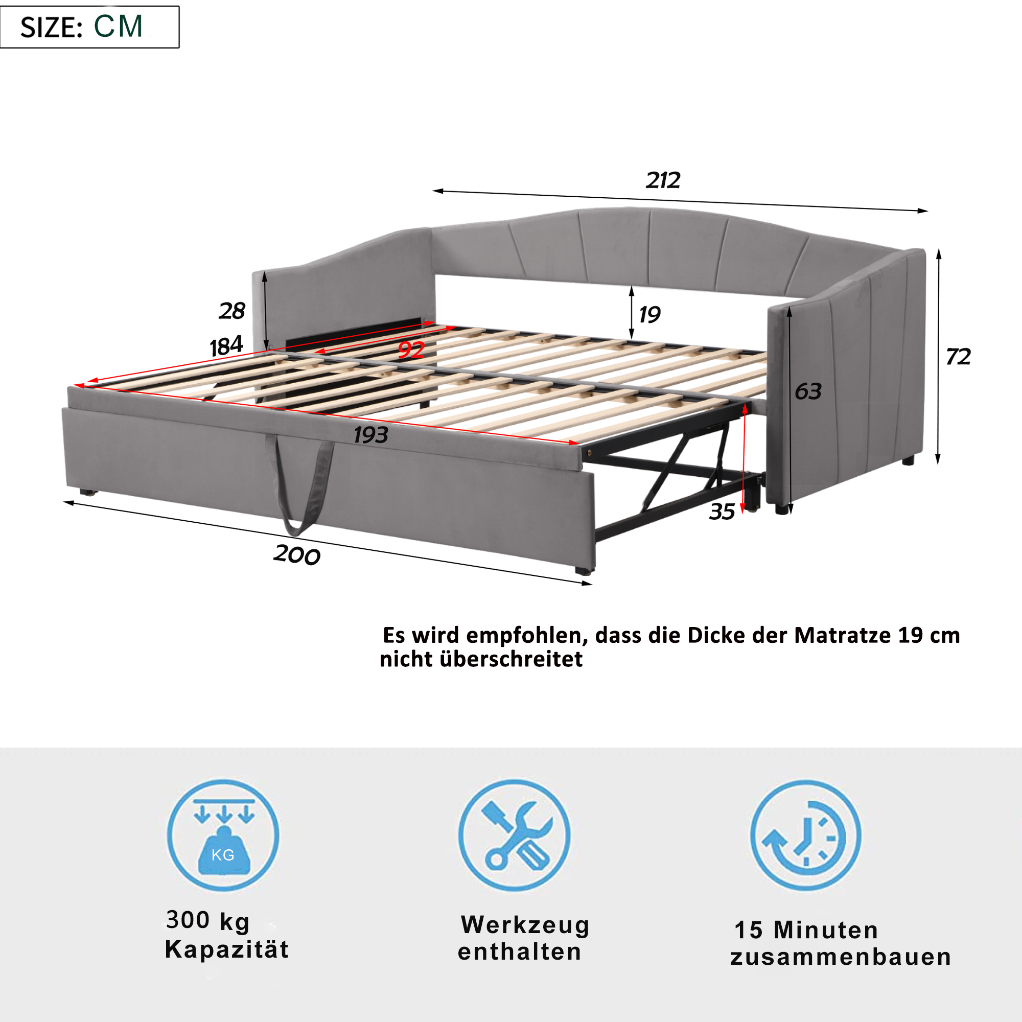 【Canapé - lit rembourré】:Ce canapé - lit est fait de tissu de velours pro - peau avec des matériaux écologiques MDF, FSC de haute qualité à l'intérieur, sûr et durable avec une bonne respirabilité pour un sommeil confortable. 【Cadre de lit rétractable】:Au fond de ce cadre de lit en bois se trouve un deuxième cadre extensible. Les deux cadres de lit peuvent être joints et mesurent 180 x 200 cm, ce qui permet de créer facilement un lit simple ou double. 【Design pour économiser de l'espace】:Le lit propre au bas du canapé - lit peut être facilement tiré ou enfoncé, ce qui permet d'économiser beaucoup d'espace. Idéal pour les petites chambres, les appartements et les Chambres. 【Avec cadre à Lattes】:Canapé - lit rembourré avec des lattes de bois robustes, un dossier confortable rembourré et deux accoudoirs. Veuillez noter que le matelas n'est pas inclus. Le matelas recommandé est composé de deux matelas de 14 cm de hauteur. 【Facile à assembler】:Les instructions d'installation de ce cadre de lit sont précises et détaillées. Vous pouvez facilement suivre toutes les étapes d'installation en suivant les instructions. Le canapé - lit a deux paquets et parfois les deux boîtes ne sont pas les mêmes. La date est arrivée, s'il vous plaît attendre deux ou trois jours ou contacter notre service à la clientèle amical pour plus d'aide. Ce canapé - lit rembourré moderne est équipé d'un cadre de lit extensible qui peut être converti de 90 x 200 cm à 180 x 200 cm. Si vous êtes à la recherche d'un lit polyvalent, ce canapé - lit gigogne rembourré est parfait pour vous. Ce lit rembourré de haute qualité a deux accoudoirs gauche et droite, a un dossier, contient un cadre à lattes et ne nécessite pas de lit à ressorts. La structure 2 - en - 1 peut non seulement être utilisée comme lit d'adolescent ou lit bébé, mais aussi pour les visiteurs, le lit de poulie est le meilleur choix, car il économise non seulement de l'espace, mais semble également pratique.ce lit rembourré est non seulement beau, mais aussi pratique. Que vous le placiez dans votre chambre ou dans votre salon, il convient parfaitement à tous vos besoins.