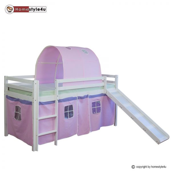 Lit Simple Blanc 90x200 en hauteur avec echelle Rideau et Tunnel Rose et Toboggan