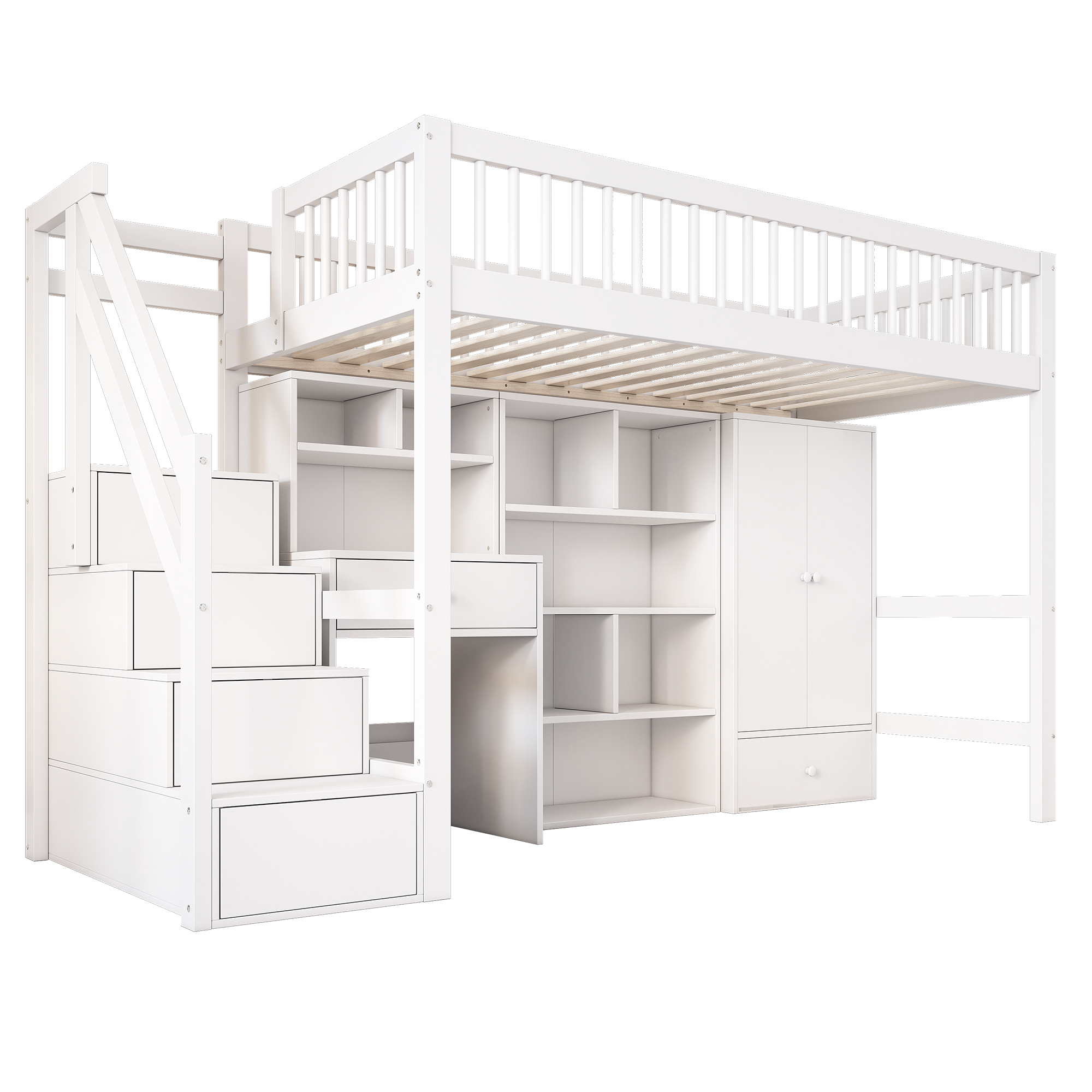 Libellé Lit simple enfant blanc 90*200, en bois massif, avec bureau, escalier, armoire de rangement, penderie, sans matelas