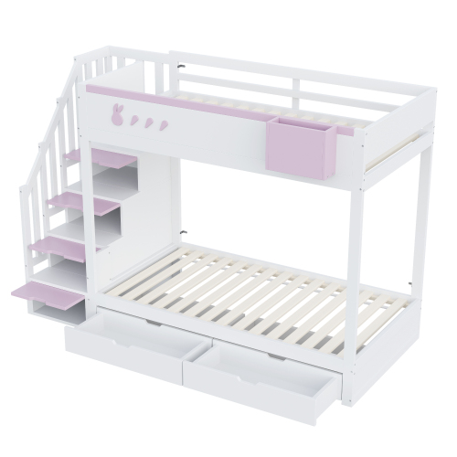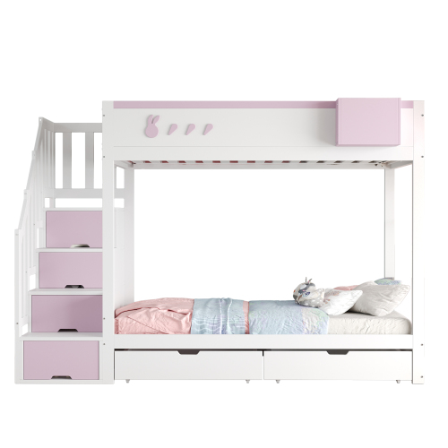 Ce lit superposé double est doté d'une échelle de sécurité latérale faisant également office d'espace de rangement. La porte du placard sous l'échelle s'ouvre facilement, offrant un espace supplémentaire pour les vêtements, les jouets ou autres objets essentiels. Son design harmonieux complète l'esthétique générale du lit. Deux grands tiroirs sous le lit offrent un espace de rangement généreux. Les deux lits superposés sont équipés de sommiers à lattes pour un maintien optimal du matelas.