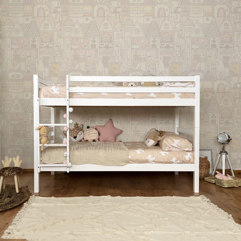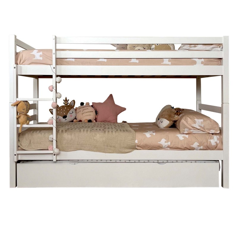 Lit superposé en bois de pin massif pouvant accueillir jusqu'à trois matelas. Notre lit superposé pour enfants est disponible en blanc lavé ou en blanc, il constitue une solution parfaite pour les chambres à coucher dont l'espace est limité. Vous avez plusieurs options à combiner avec un lit gigogne Popins, un lit pieds pliants Campanilla ou des tiroirs Big Chip.