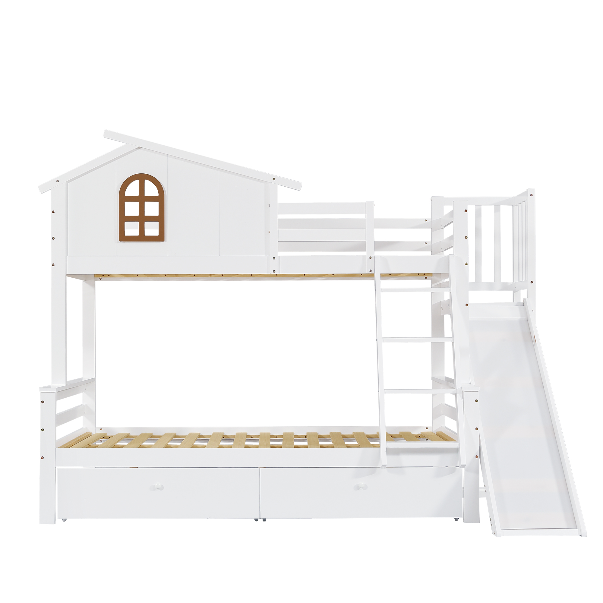 Lit superposé en bois massif blanc avec fenêtre caractéristique, toboggan et deux tiroirs, lit enfant et