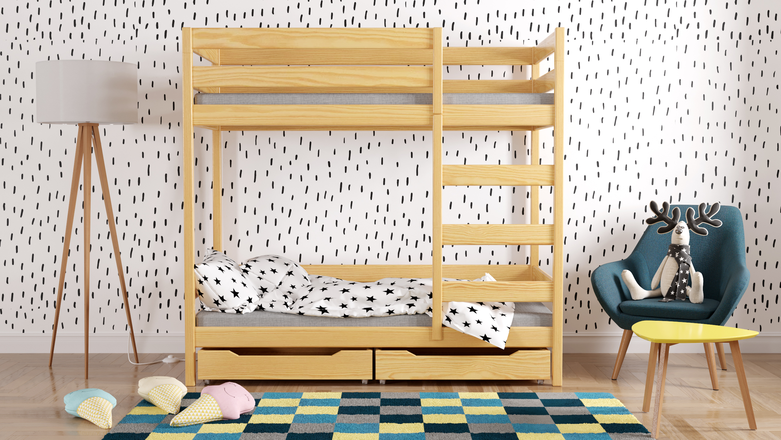 Vous pouvez adapter le lit à vos besoins - vous décidez lors du montage si vous souhaitez monter l’échelle à gauche ou à droite. Le poids maximum supporté par le cadre de lit est de 150 kg. Le lit est en pin massif. Le lit est adapté aux matelas d’une épaisseur de 10-12 cm. Les lits superposés peuvent être placés dans de petits chambres, où chaque cm2 est très important. La hauteur du lit au point le plus élevé est de 180 cm. Le lit peut être fixé au mur, ce qui le rend encore plus stable et votre enfant dort en toute sécurité. Le linge de lit et le matelas ne sont pas inclus.