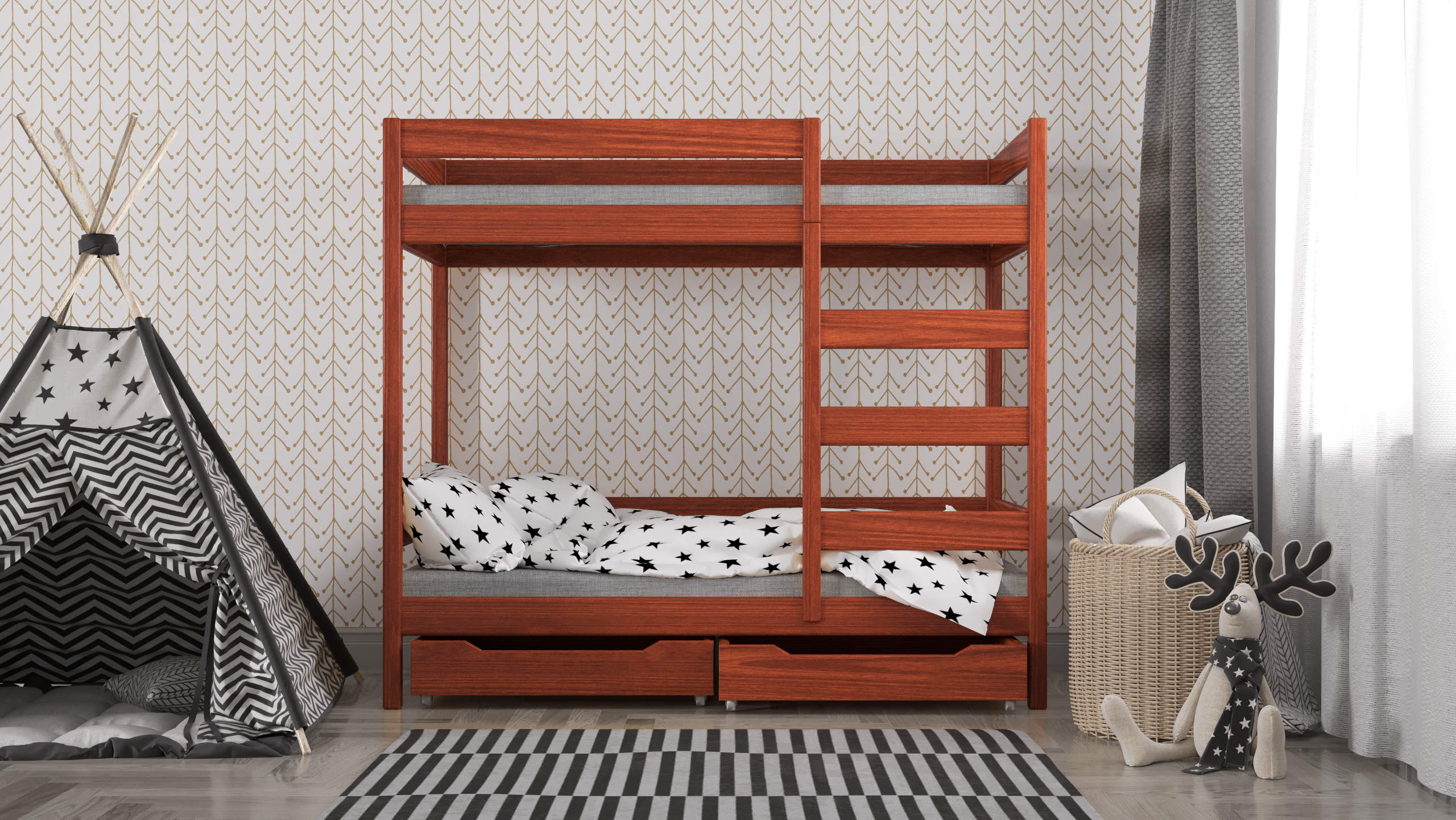 Vous pouvez adapter le lit à vos besoins - vous décidez lors du montage si vous souhaitez monter l’échelle à gauche ou à droite. Le poids maximum supporté par le cadre de lit est de 150 kg. Le lit est en pin massif. Le lit est adapté aux matelas d’une épaisseur de 10-12 cm. Les lits superposés peuvent être placés dans de petits chambres, où chaque cm2 est très important. La hauteur du lit au point le plus élevé est de 180 cm. Le lit peut être fixé au mur, ce qui le rend encore plus stable et votre enfant dort en toute sécurité. Le linge de lit et le matelas ne sont pas inclus.