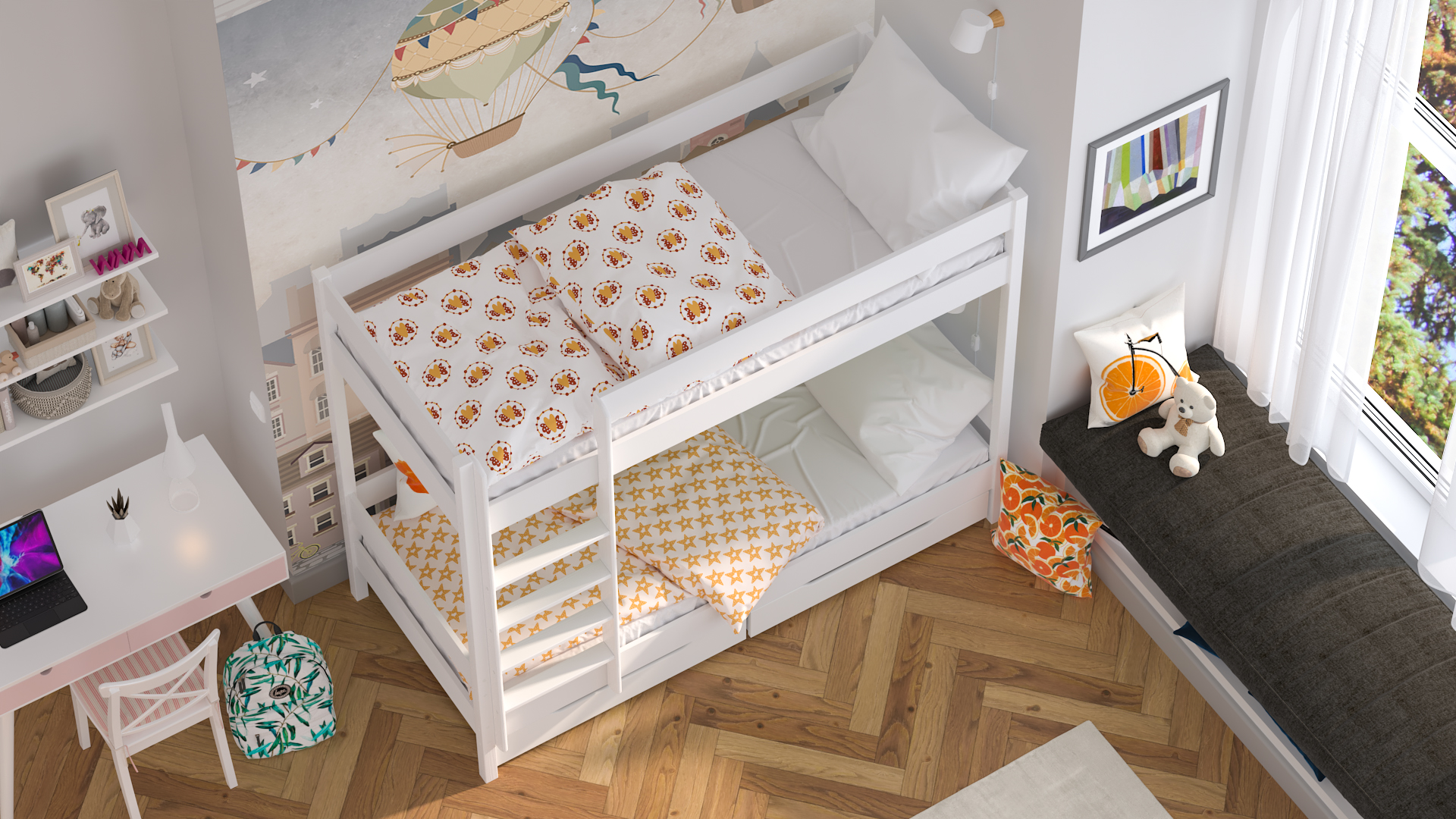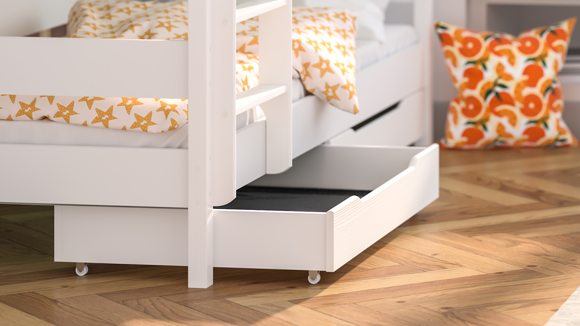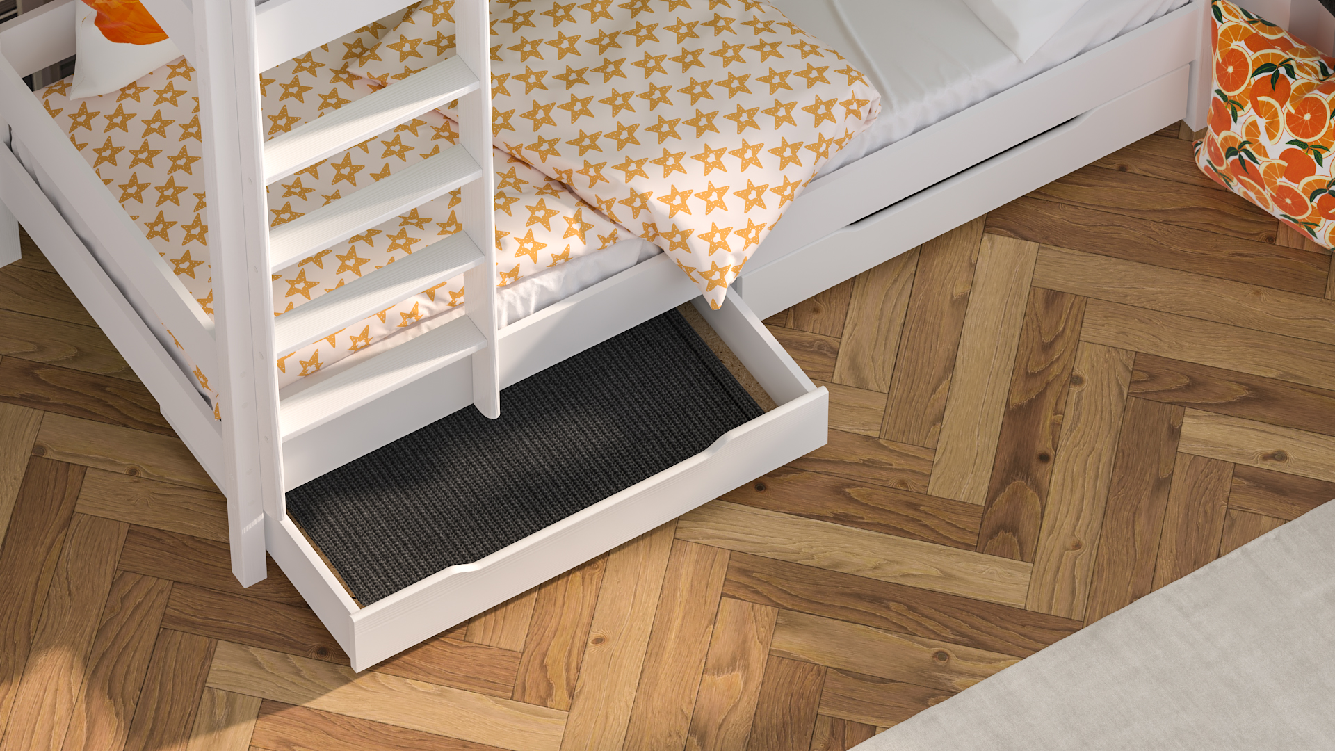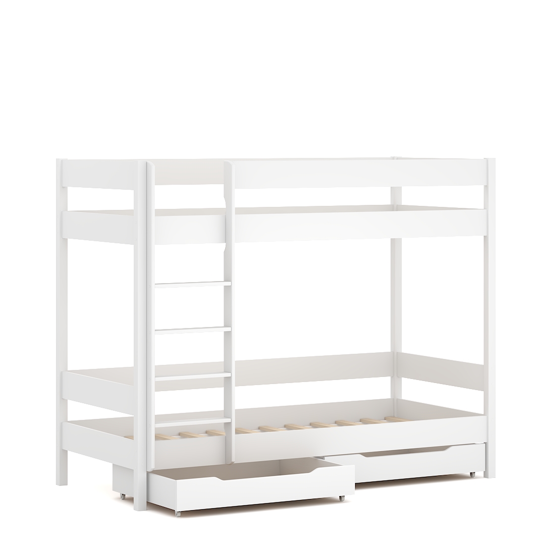 Vous pouvez adapter le lit à vos besoins - vous décidez lors du montage si vous souhaitez monter l’échelle à gauche ou à droite. Le poids maximum supporté par le cadre de lit est de 150 kg. Les pieds de lit et l'échelle sont en pin massif. Le lit est adapté aux matelas d’une épaisseur de 10-12 cm. Les lits superposés peuvent être placés dans de petits chambres, où chaque cm2 est très important. La hauteur du lit au point le plus élevé est de 160 cm. Le lit peut être fixé au mur, ce qui le rend encore plus stable et votre enfant dort en toute sécurité. Le linge de lit et le matelas ne sont pas inclus.