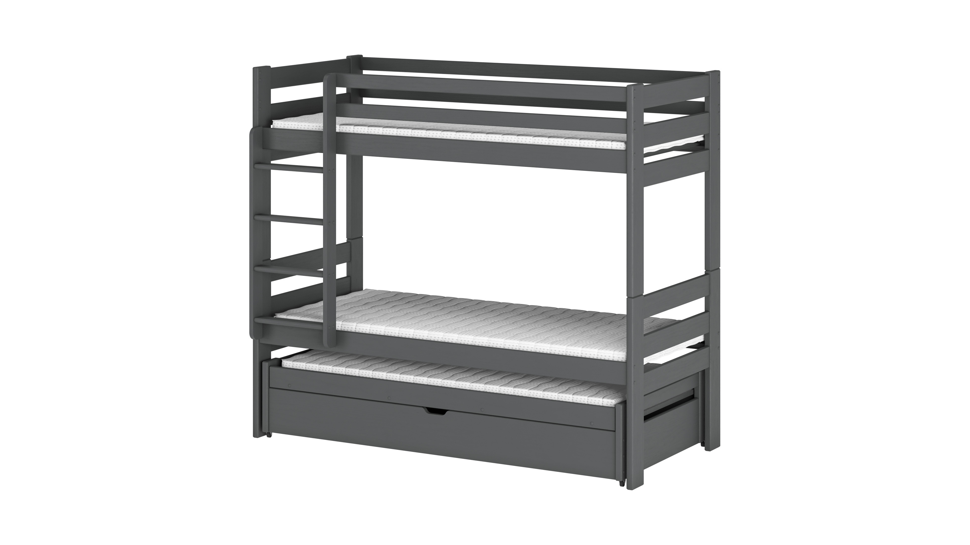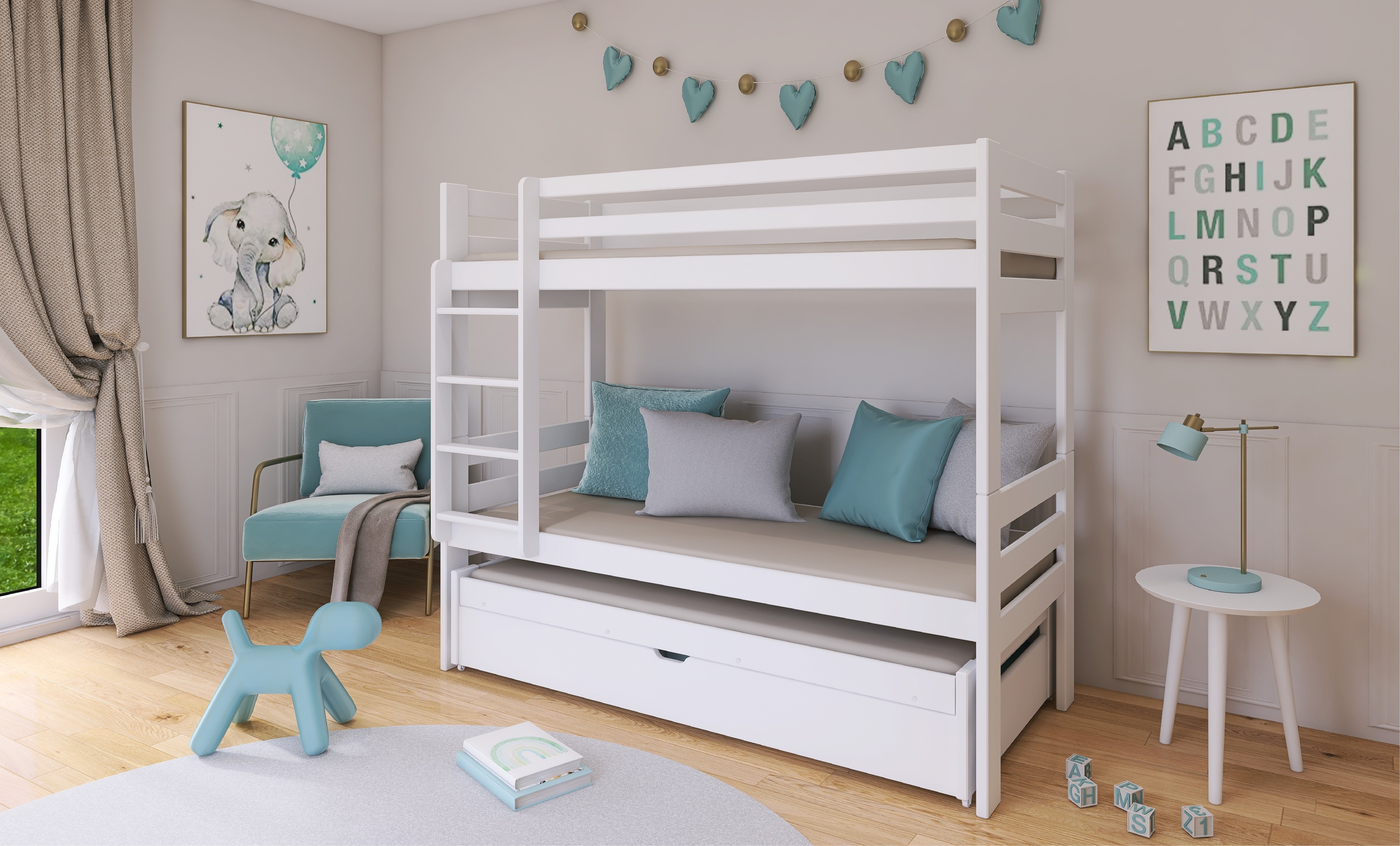 Un lit superposé dessi - trois enfants heureux et reposés Vous aimeriez certainement économiser de l'espace lors de la mise en place d'une salle de frères. Peut-être que vous voulez toujours avoir une zone de couchage supplémentaire pour les invités à portée de main. Le lit superposé de Furnlux leser remplit ces deux conditions et bien plus encore.
