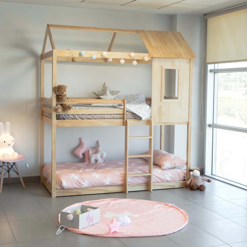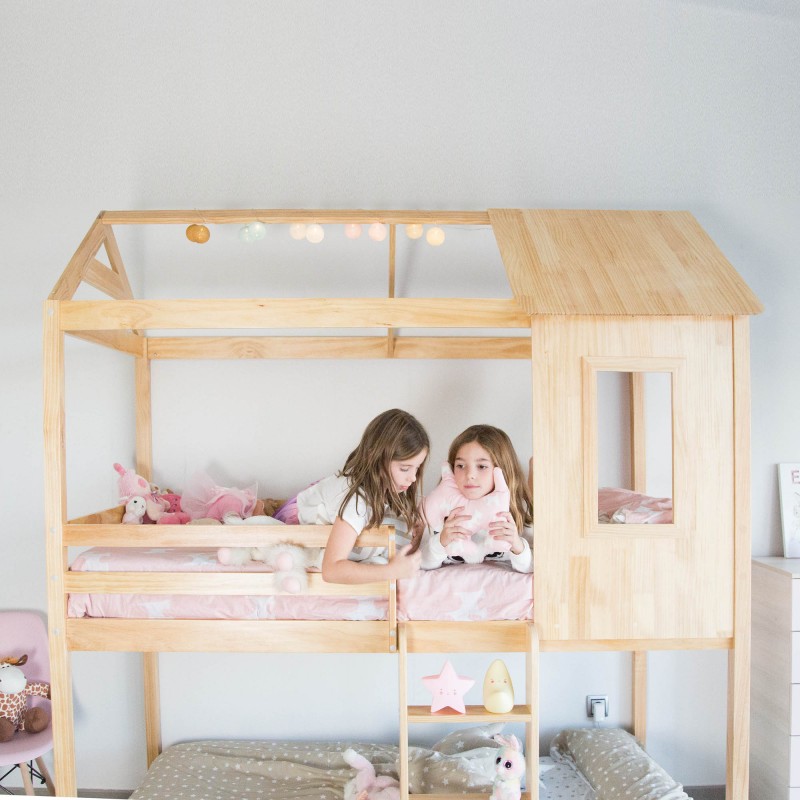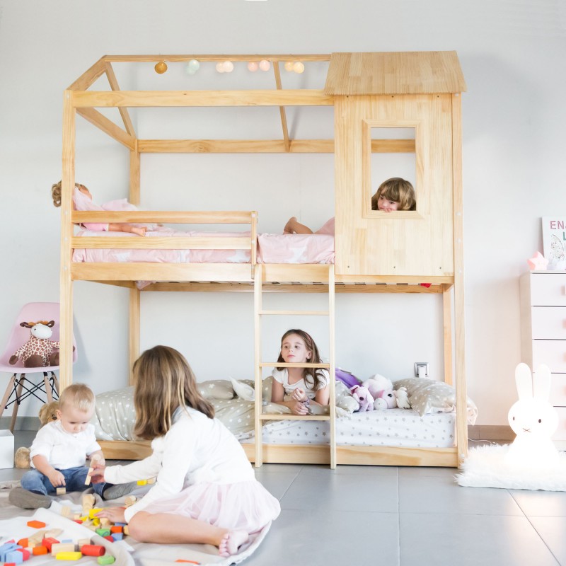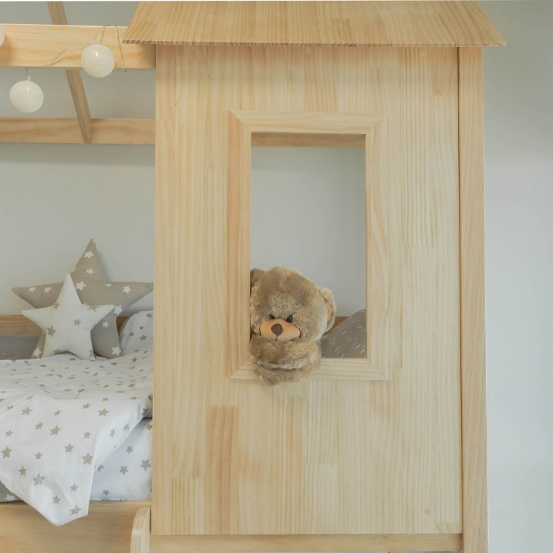 Spectaculaire lit superposé Montessori pour enfants avec un design original d'une petite maison. Il est disponible en blanc et en couleur pin, idéal pour se combiner avec la décoration de la chambre d'enfant. Le lit pour enfants en forme de maison est parfait pour les chambres amusantes. Les fenêtres et le toit peuvent être modifiés latéralement.