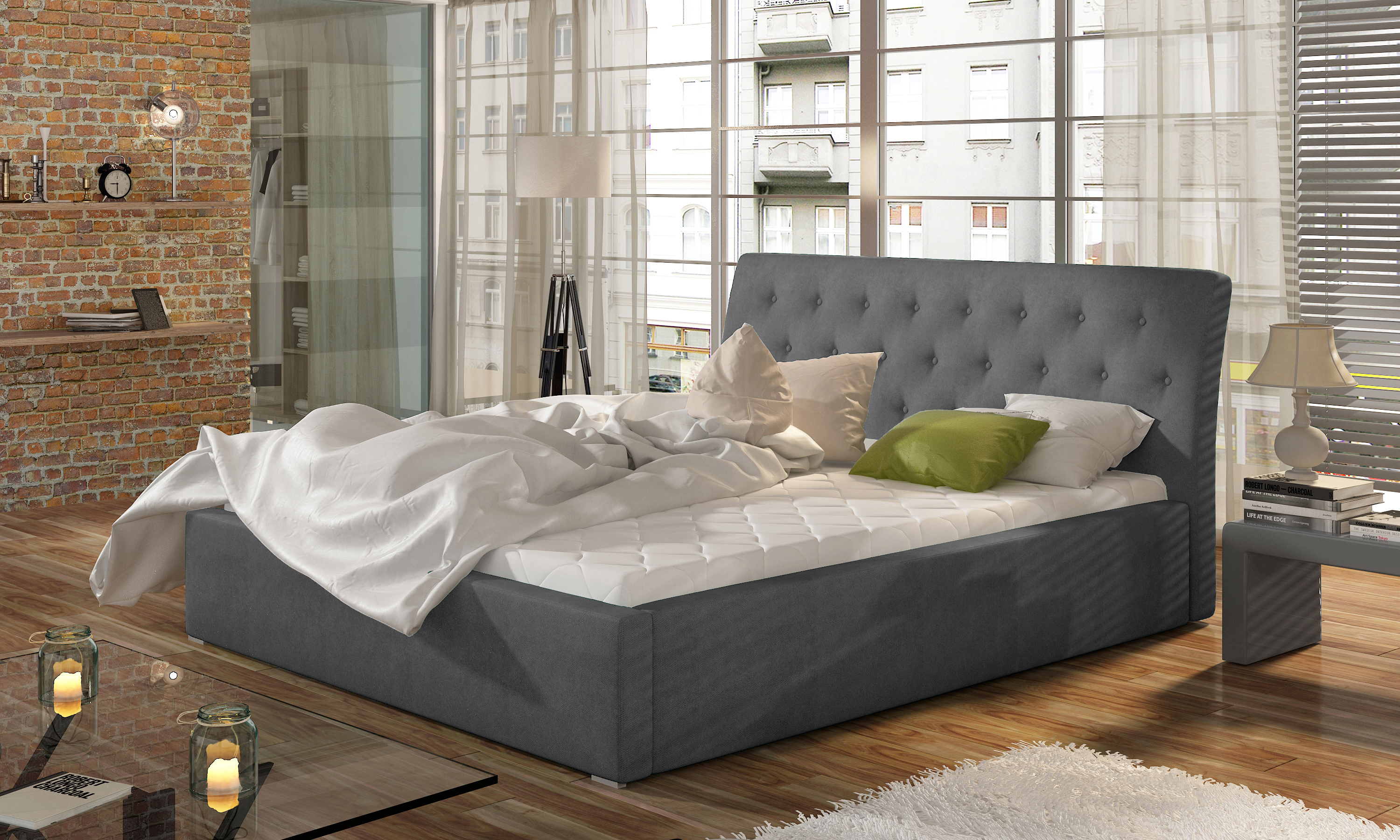 Lit velours capitonné Venizia-Couleur Gris-200x200-Version avec sommier