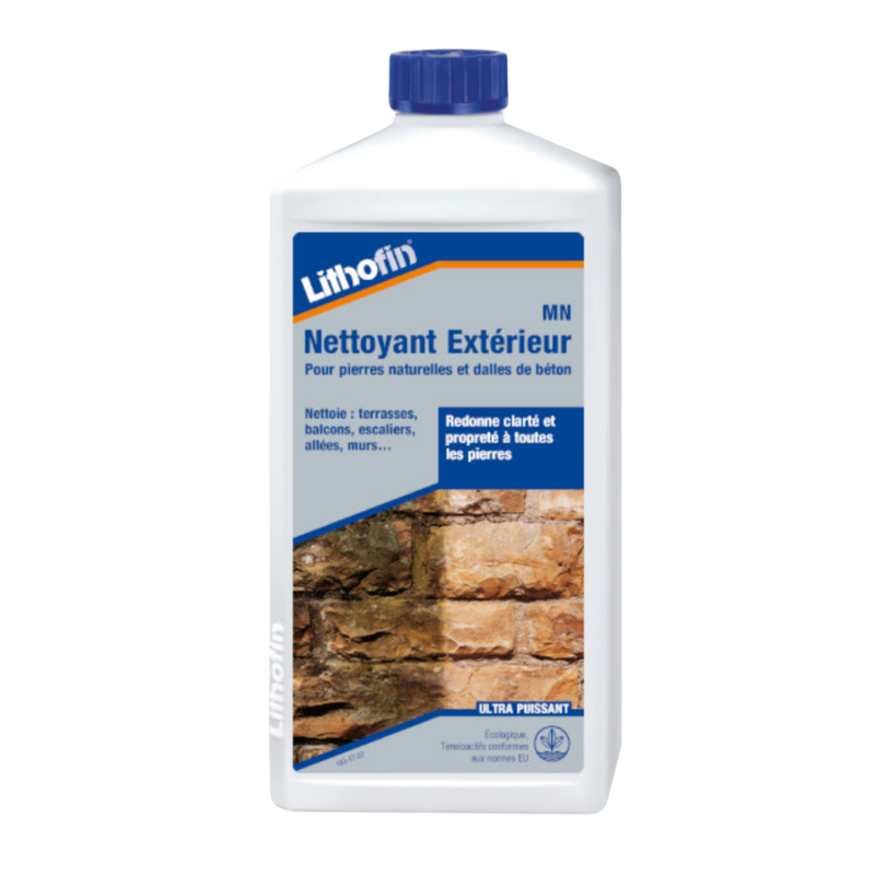 MN Nettoyant Extérieur - Nettoyant chloré pour les dépôts organiques sur la pierre naturelle - Lithofin Lithofin MN Nettoyant Extérieur est un nettoyant puissant à base de chlorures actifs et d'additifs spéciaux. Lithofin MN Nettoyant Extérieur agit rapidement et en profondeur, sans abîmer les matériaux. Il dissout et élimine les noircissements et salissures tenaces ainsi que les décolorations sombres provoquées par les plantes ou les feuilles. Spécifications techniques : Densité : 1,1 g/cm3 pH : 13 environ (concentré) Aspect : jaunâtre, limpide Odeur : légèrement âcre Solubilité dans l'eau : très bonne Domaine d'application : Pour un nettoyage intensif et en profondeur de toutes les pierres naturelles et artificielles à l'extérieur (murs, trottoirs, escaliers, terrasse, etc. par exemple). Permet également d'enlever les taches d'humidité sombres des jointures de silicone. Mode d'emploi : Appliquer au pulvérisateur Lithofin MN Nettoyant Extérieur non dilué et répartir avec une brosse. Au bout de 2 à 10 heures, brosser avec de l'eau, rincer ou laisser la pluie rincer le revêtement. Avec des salissures tenaces, jusqu’à 10 heures pour obtenir le meilleur résultat. Toujours verifier la résistance chimique des joints –surtout avec des mortiers de drainage – quand le produit doit agir plus que 2 heures. Il faudra répéter l'opération dans les cas difficiles Attention : nettoyer immédiatement à grande eau les éclaboussures sur les plantes. Les textiles, les métaux, le bois, etc. doivent être protégés des éclaboussures. Rendement : jusqu'à 15 m²/L environ. Ancien nom : MN Nettoyant Extérieur - Élimine les dépôts organiques - Lithofin