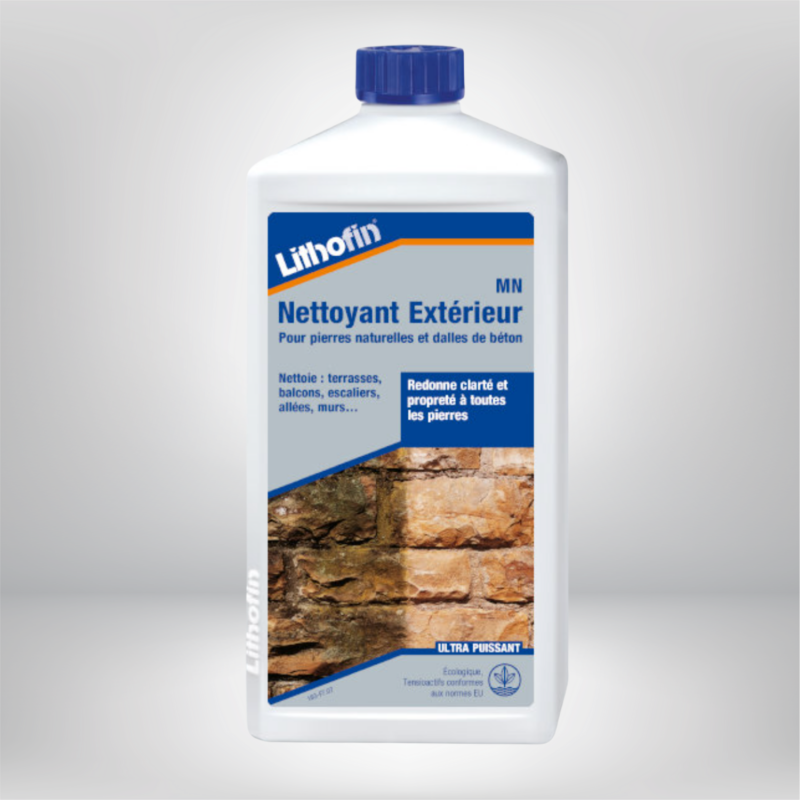 MN Nettoyant Extérieur - Nettoyant chloré pour les dépôts organiques sur la pierre naturelle - Lithofin Lithofin MN Nettoyant Extérieur est un nettoyant puissant à base de chlorures actifs et d'additifs spéciaux. Lithofin MN Nettoyant Extérieur agit rapidement et en profondeur, sans abîmer les matériaux. Il dissout et élimine les noircissements et salissures tenaces ainsi que les décolorations sombres provoquées par les plantes ou les feuilles. Spécifications techniques : Densité : 1,1 g/cm3 pH : 13 environ (concentré) Aspect : jaunâtre, limpide Odeur : légèrement âcre Solubilité dans l'eau : très bonne Domaine d'application : Pour un nettoyage intensif et en profondeur de toutes les pierres naturelles et artificielles à l'extérieur (murs, trottoirs, escaliers, terrasse, etc. par exemple). Permet également d'enlever les taches d'humidité sombres des jointures de silicone. Mode d'emploi : Appliquer au pulvérisateur Lithofin MN Nettoyant Extérieur non dilué et répartir avec une brosse. Au bout de 2 à 10 heures, brosser avec de l'eau, rincer ou laisser la pluie rincer le revêtement. Avec des salissures tenaces, jusqu’à 10 heures pour obtenir le meilleur résultat. Toujours verifier la résistance chimique des joints –surtout avec des mortiers de drainage – quand le produit doit agir plus que 2 heures. Il faudra répéter l'opération dans les cas difficiles Attention : nettoyer immédiatement à grande eau les éclaboussures sur les plantes. Les textiles, les métaux, le bois, etc. doivent être protégés des éclaboussures. Rendement : jusqu'à 15 m²/L environ. Ancien nom : MN Nettoyant Extérieur - Élimine les dépôts organiques - Lithofin
