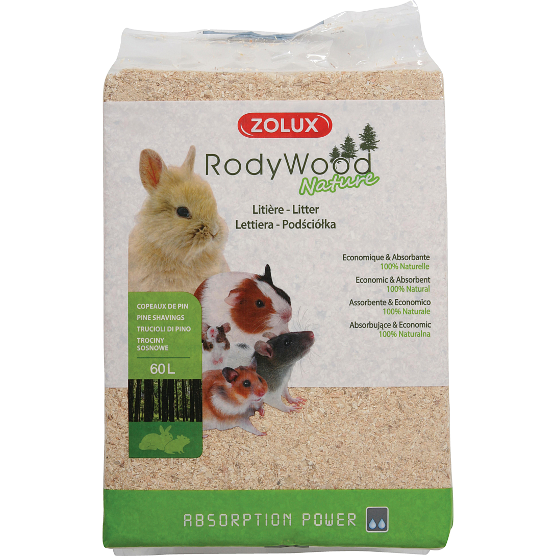 Litière RodyWood est une litière végétale 100% naturelle (copeaux de pin), biodégradable et compostable, diffusant une agréable odeur de bois. Fabriqué en France. Disponible en plusieurs formats : 16L, 60L, 165L et 350L.