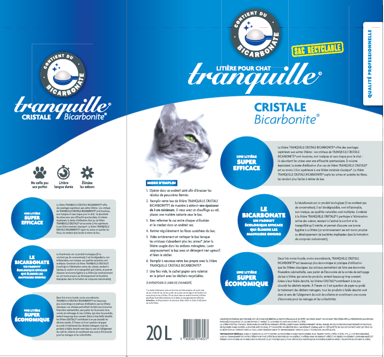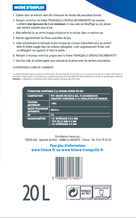| Libellé | Litière tranquille cristale bicarbonite 20 litres |