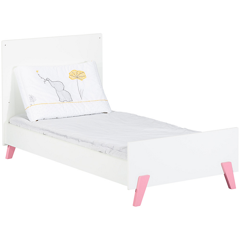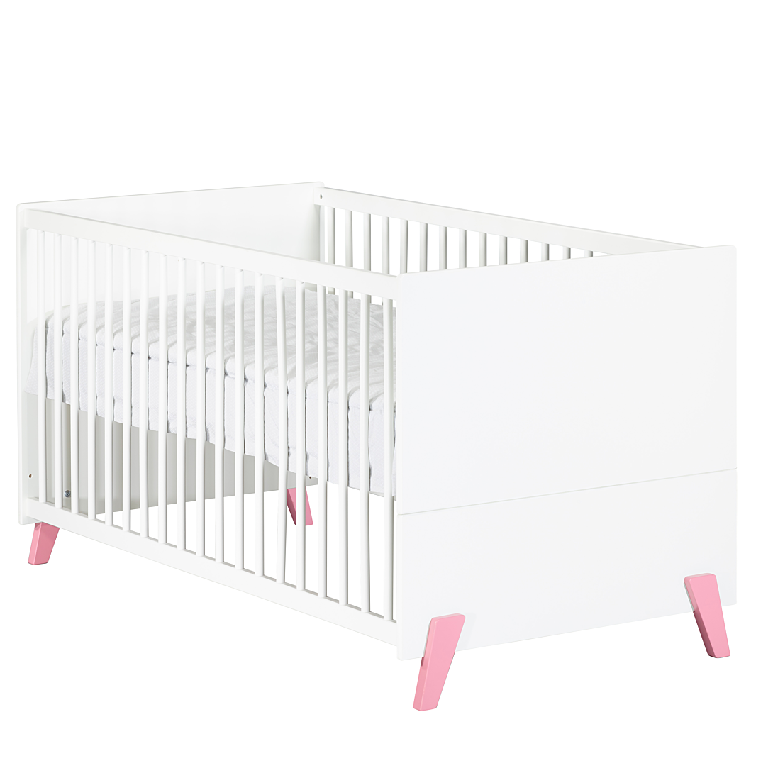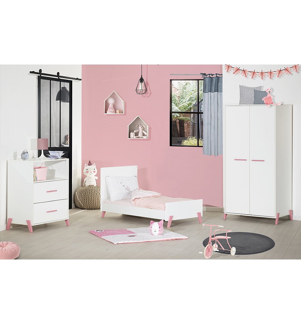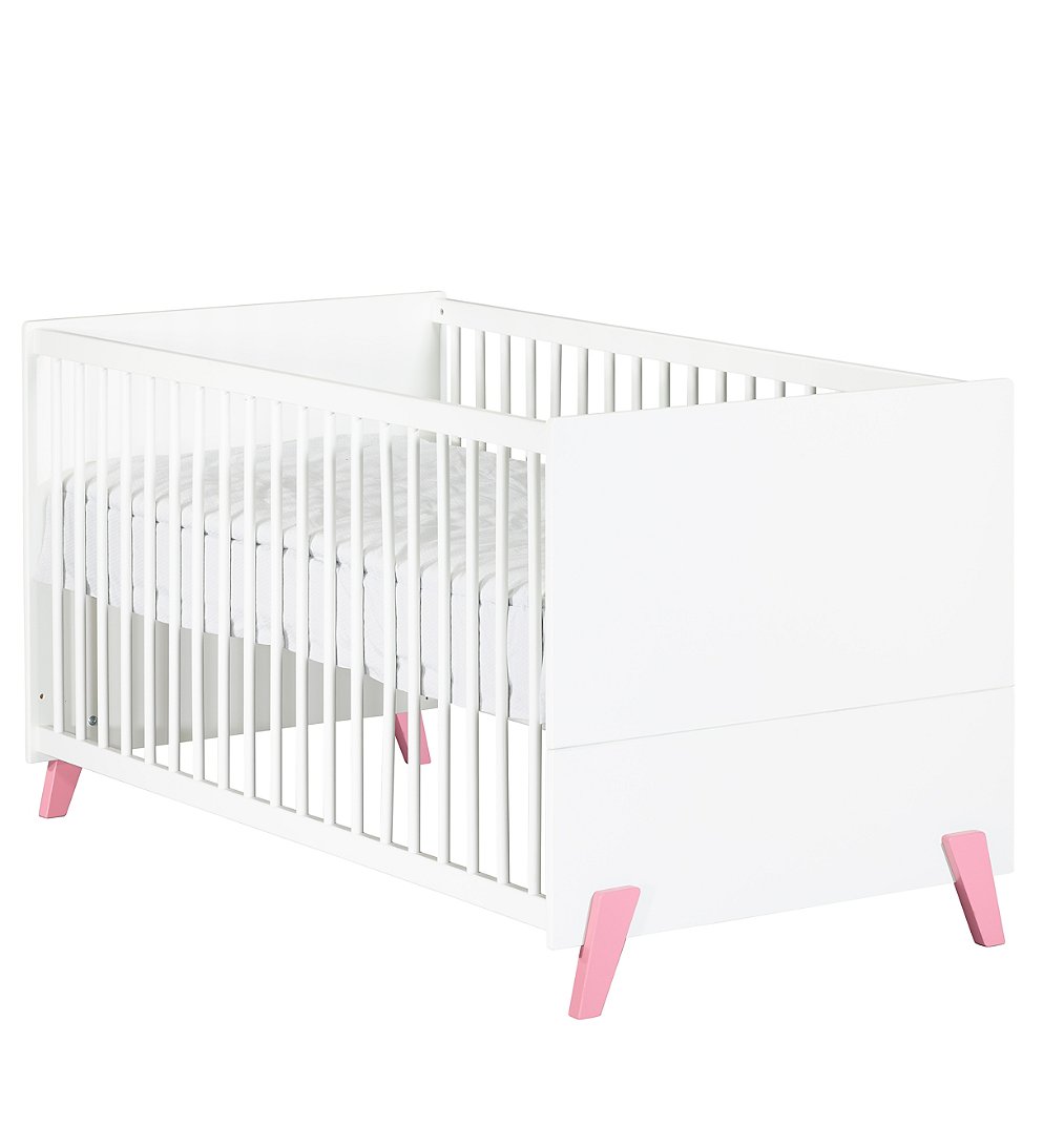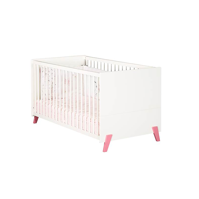 Lit bébé évolutif 140x70 avec pieds rose - Little Big Bed JOY ROSE Le lit bébé évolutif JOY de style scandinave est idéal pour une chambre de bébé tendance avec une touche de couleur. Design et confortable, il vous séduira surtout par son côté évolutif. Le little big bed accompagnera votre enfant jusqu'à ses 7 ans. Dès la naissance, Bébé pourra dormir dans son lit à barreaux 70x140 cm, puis à 3 ans environ, il vous suffira d'utiliser les éléments de transformation pour lui offrir un lit de grand. Pour une chambre complète, vous pourrez associer à votre lit, la commode 2 tiroirs avec plan à langer et l'armoire 2 portes. Caractéristiques du lit JOY: 2 Galeries fixes en hêtre, avec balustres ronds, laquées blanc. Sommier en hêtre brut réglable 3 positions. Tête et Pied en panneaux de fibres de moyenne densité (MDF ) , laqués blanc. 4 pieds en hêtre laqués rose poudré. 2 long-pans de transformation en panneaux de particules mélaminés décor blanc. Fabrication française Garanti sans solvant Conforme aux normes de sécurité en vigueur Dimensions du lit évolutif JOY: 146 x 77 x 77cm Couchage: 140x70cm