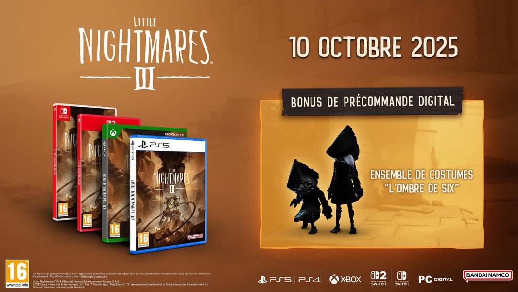 Lancez-vous dans une nouvelle aventure dans le monde unique de Little Nightmares. Dans Little Nightmares III, vous accompagnez Low et Alone dans leur voyage vers la sortie du Nulle-Part. Perdus au coeur de la Spirale et de ses lieux plus perturbants les uns que les autres, les deux amis devront coopérer pour survivre dans un monde périlleux empli d'illusions et échapper à la terrible menace tapie dans l'ombre. Pour la première fois, affrontez vos peurs d'enfant à deux avec le mode coopération en ligne ou faites-leur face en solo avec un compagnon contrôlé par ordinateur. Eléments principaux : AFFRONTEZ VOS PEURS D'ENFANT ENSEMBLE Choisissez entre deux personnages inédits, chacun équipé de leurs propres objets emblématiques. Jouez en solo avec le 2ème personnage contrôlé par l'ordinateur ou à deux en mode coopération en ligne pour résoudre ensemble les énigmes qui se présenteront à vous et vous défendre contre de petits ennemis.