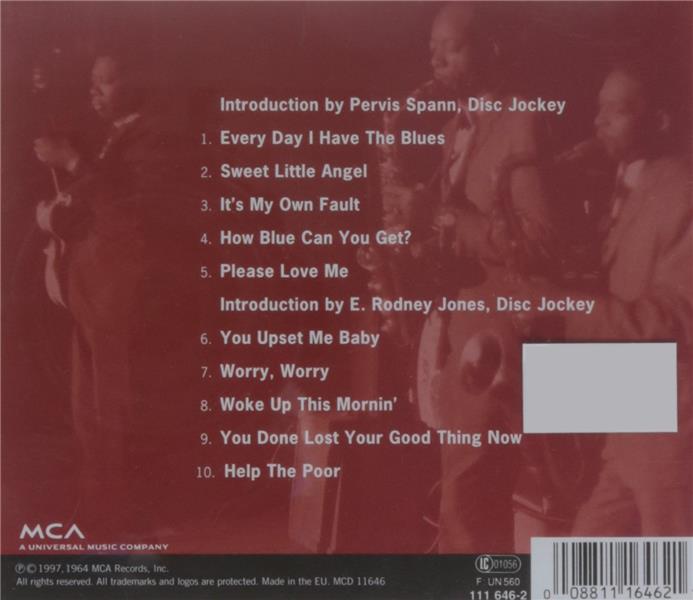 Liste des pistes 1.01 . every day i have the blues (introduction by spann pervis, disc jockey) - B.B. King1.02 . sweet little angel - B.B. King1.03 . it's my own fault - B.B. King1.04 . how blue can you get ? - B.B. King1.05 . please love me - B.B. King1.06 . you upset me baby (introduction by jones e. rodney, disc jockey) - B.B. King1.07 . worry, worry - B.B. King1.08 . woke up this mornin' - B.B. King1.09 . you done lost your good thing now - B.B. King1.10 . help the poor - B.B. King