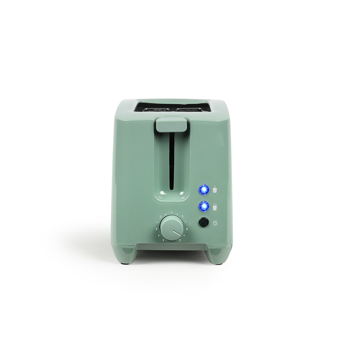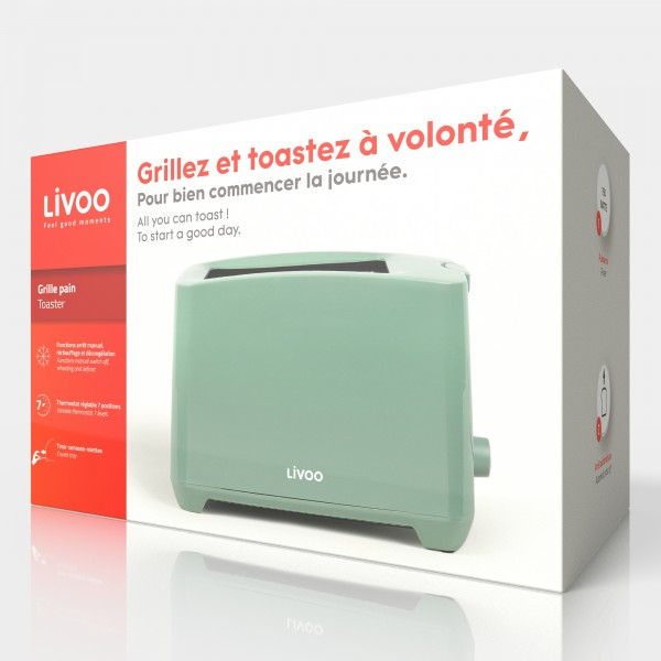 2 fentes. Puissance 650-750 W. 3 fonctions avec témoins LED: décongélation, réchauffage, arrêt manuel. Thermostat réglable : 7 niveaux. Tiroir ramasse-miettes amovible. Ejection automatique. Range cordon