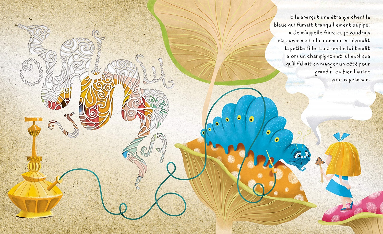 Alice s'ennuie près de sa soeur aînée. Elle rêve alors d'un lapin blanc qu'elle suit dans un terrier. Il l'entraîne dans des aventures vertigineuses qui défient toutes les lois de la logique. Avec six pages décorées et travaillées au laser.