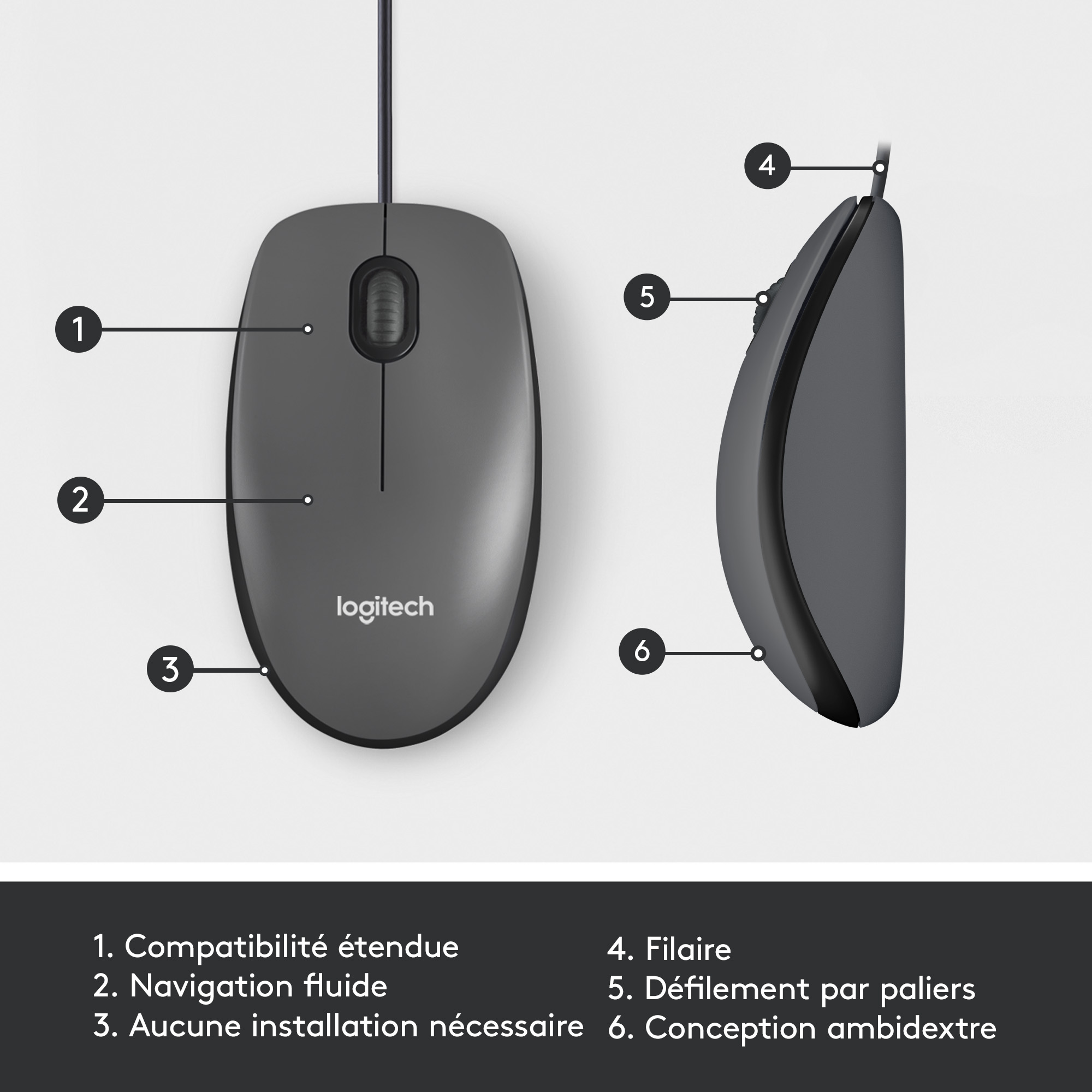 | Libellé | Logitech M100 Souris USB Filaire, Ambidextre - Grise |