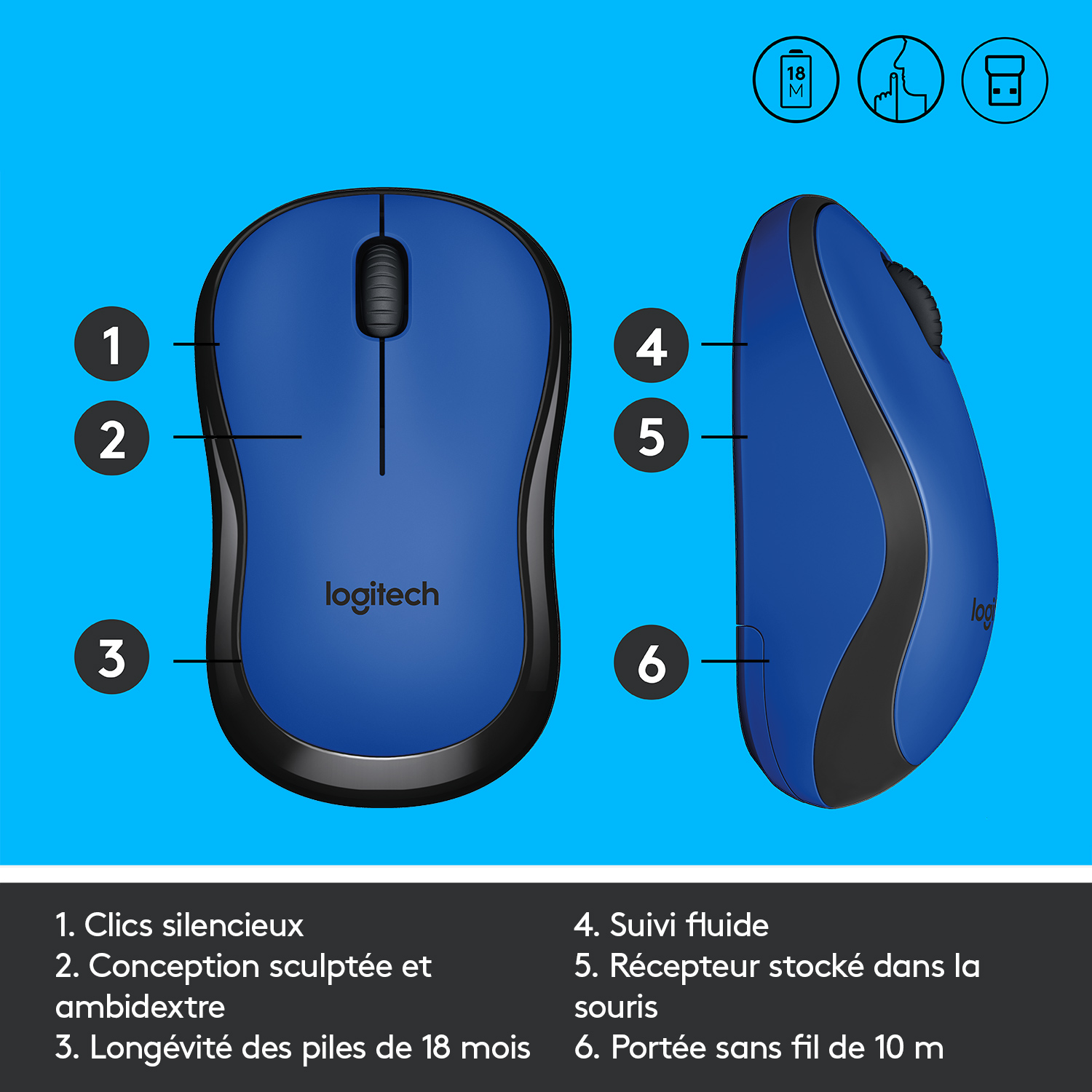 | Libellé | Logitech M220 Silent Souris Sans Fil, Ambidextre - Bleue |