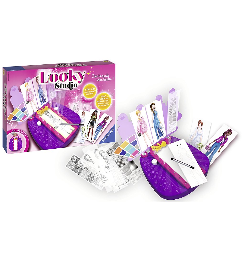 | Plus produit | CRÉE TA MODE SANS LIMITES Ton studio de styliste pour créer tes collections de mode ! Plus de 500 combinaisons de modèles sont possibles allant du style glamour au rebelle en passant par le Bohème ou le chic ! Les modèles ont été dessinés par une véritable styliste de mode. Dès 6 ans. LA MACHINE DE STYLISTE A EMPORTER Ton studio de styliste est pourvu d\'une LED mobile pour t\'aider à reproduire les modèles pas à pas. Muni d\'une poignée, il est transportable et permet de ranger tout ton matériel à l\'arrière. La mode n\'aura plus de secret pour toi, où que tu sois ! FAVORISE CONCENTRATION ET AUTONOMIE Loin des écrans, cette activité créative allie dextérité et précision pour développer l\'habilité manuelle des enfants. Une fois finis, expose tes modèles grâce au paravent inclus ou offre-les à tes proches. RECHARGE Développe ta collection avec les Looky Sketch books : Summertime (18125), Robes de soirée (18082), Petits animaux (18083) et Fantasy (20183). Utilise les modèles avec ton Looky Studio ! TOUT EST INCLUS pour devenir styliste : 1 module lumineux transportable avec rangement, 1 grand panneau paravent, 28 feuilles de tenues, 40 feuilles de silhouettes à looker, 1 stylo-feutre noir fin, 3 feuilles de nuancier et 1 notice. Nécessite 3 piles LR03 non fournies. |