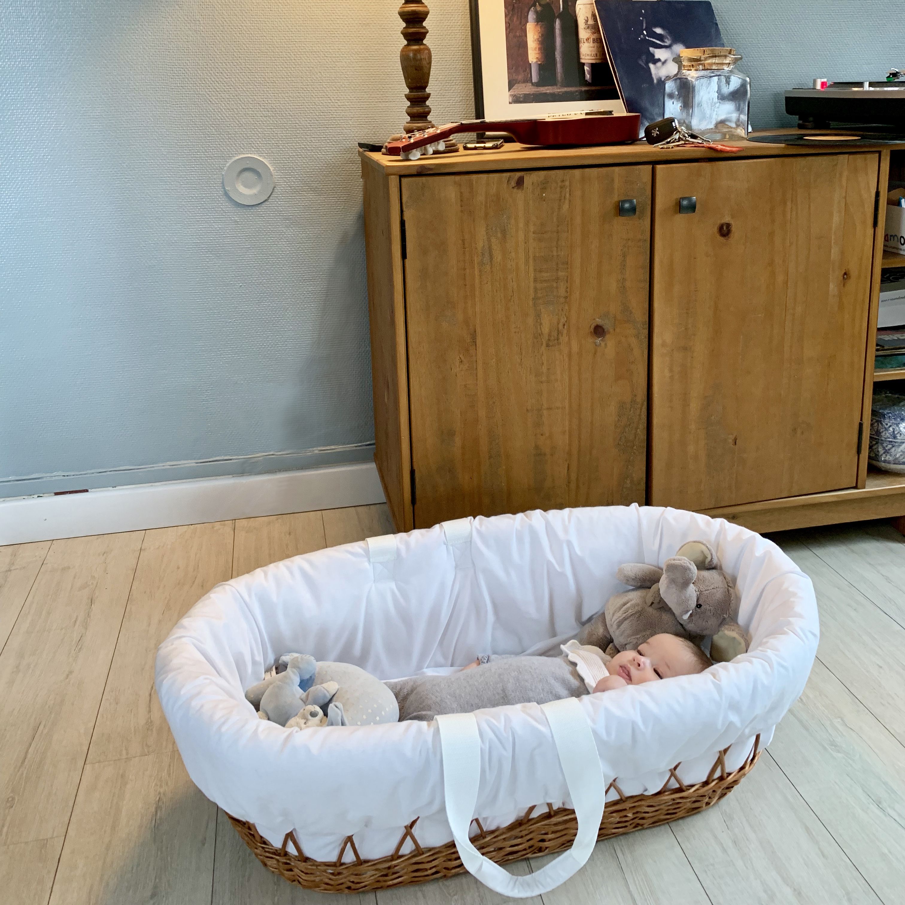 Ce couffin en osier est fait à la main par nos couturières à Montauban, en France. C'est un merveilleux cadeau pour une première naissance, avec sa poignée de transport, c'est le cocon idéal à emmener partout Les atouts - Un espace fermé, plus rassurant pour les nourrissons - Sangles pour transporter bébé dans la maison - Habillage déhoussable et lavable en machine à 60° - Fabrication française - Utilisable en intérieur ou en extérieur - S'utilise sur les supports couffin des marques Looping et Bambisol de références BSCH/SCH