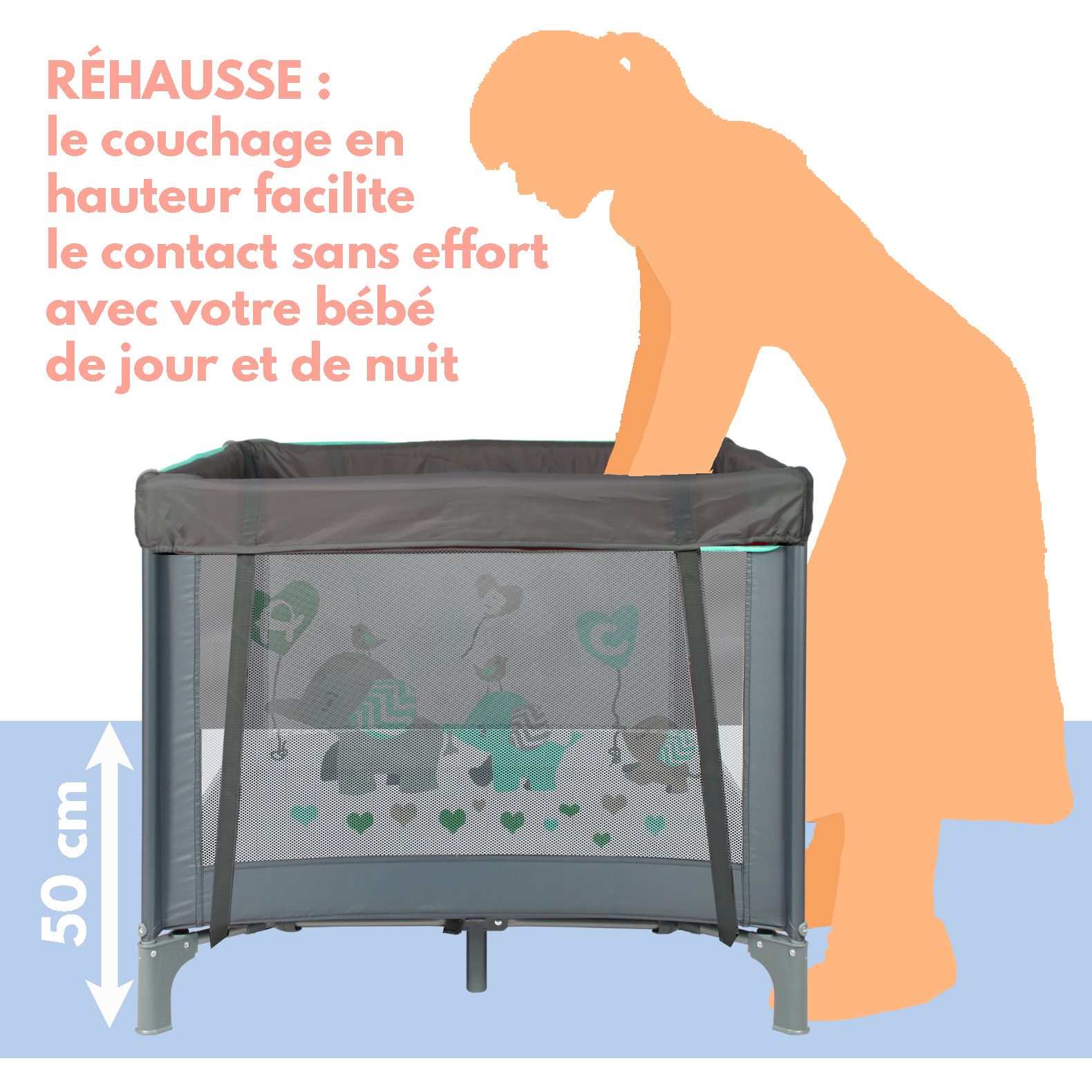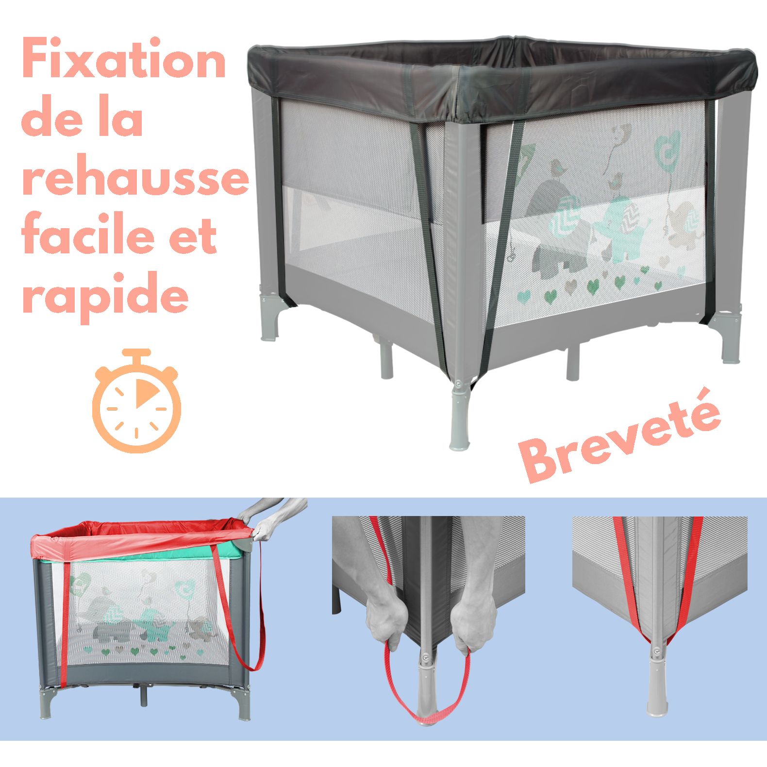 | Avertissements | FONCTION BERCEAU avec la rehausse : Avertissement ! Ne plus utiliser lorsque l'enfant peut s'asseoir, s'agenouiller ou se lever tout seul FONCTION PARC : Âges et poids conseillés de 0 à 36 mois et/ou de 3 à 15 kg maxi. Avertissement ! Ne pas laisser l'enfant sans surveillance |