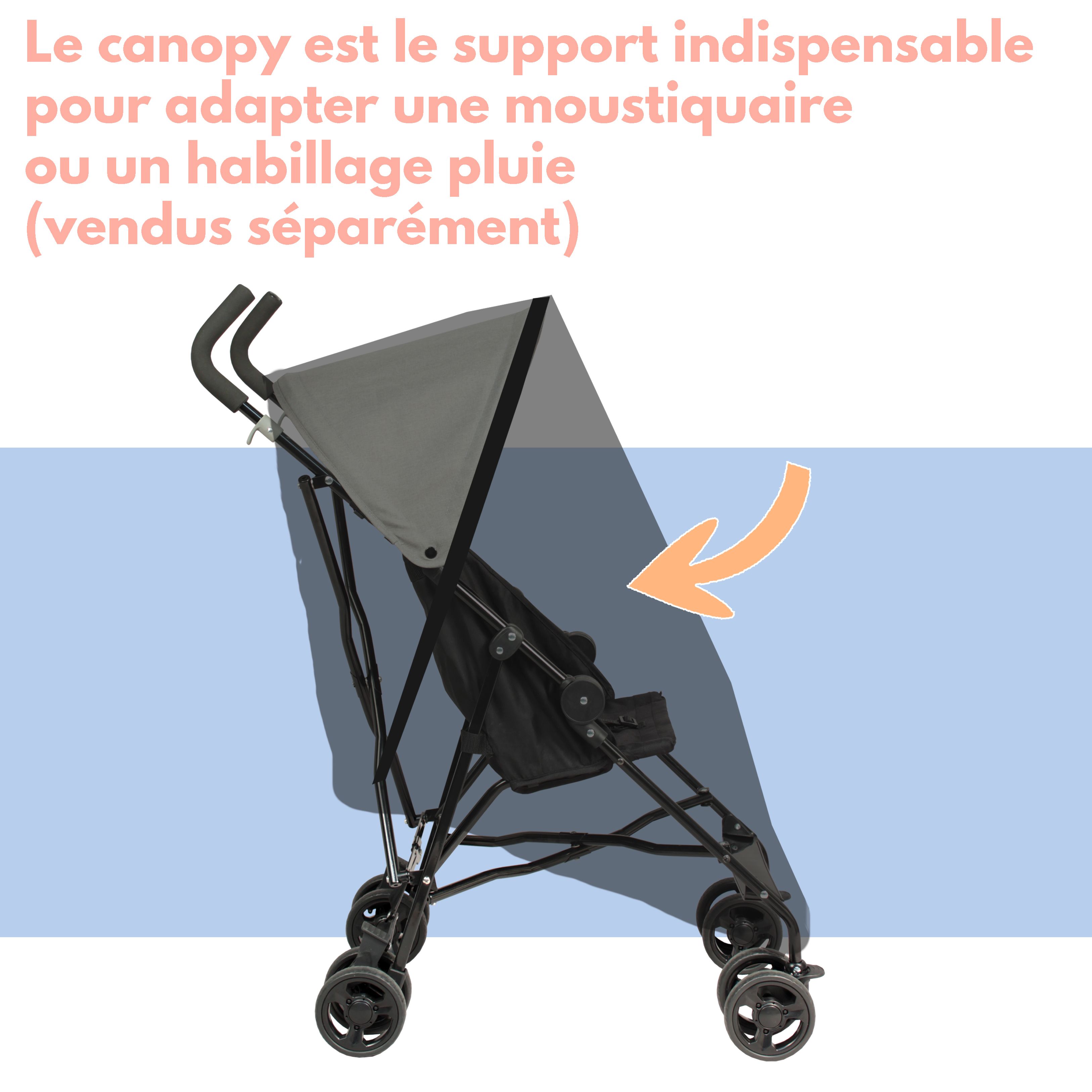 Poussette canne avec canopy pour bébé de 6 à 36 mois à emmener partout grâce à son pliage compact et son poids plume. Grand confort d'utilisation grâce aux suspensions sur les 4 roues.