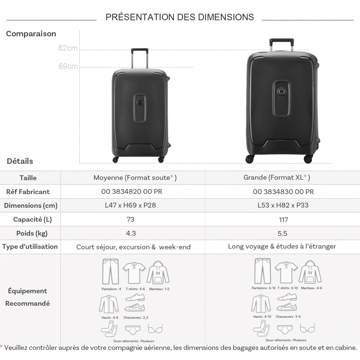 Les dimensions indiquées sont les dimensions extérieures des bagages, comprenant poignées, roulettes, pieds, poches latérales et autres éléments extérieurs.