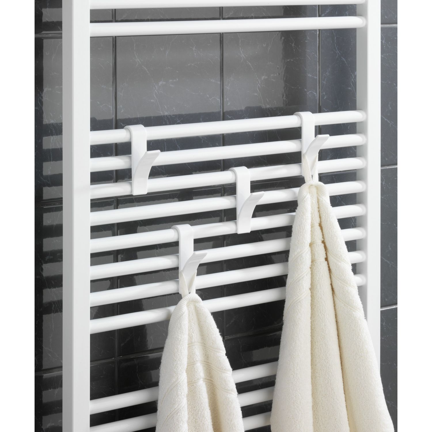 Ce lot contient 2 produits décrits ci-dessous : De l'ordre sur le radiateur de la salle de bain, voilà ce que vous garantissent ces deux crochets pratiques et robustes. Ils offrent des rangements supplémentaires pour vos serviettes en s'accrochant tout simplement sur les barres du sèche-serviettes. Placés l'un à côté de l'autre ou en décalés, vos serviettes resteront à portée de main à l'endroit souhaité.