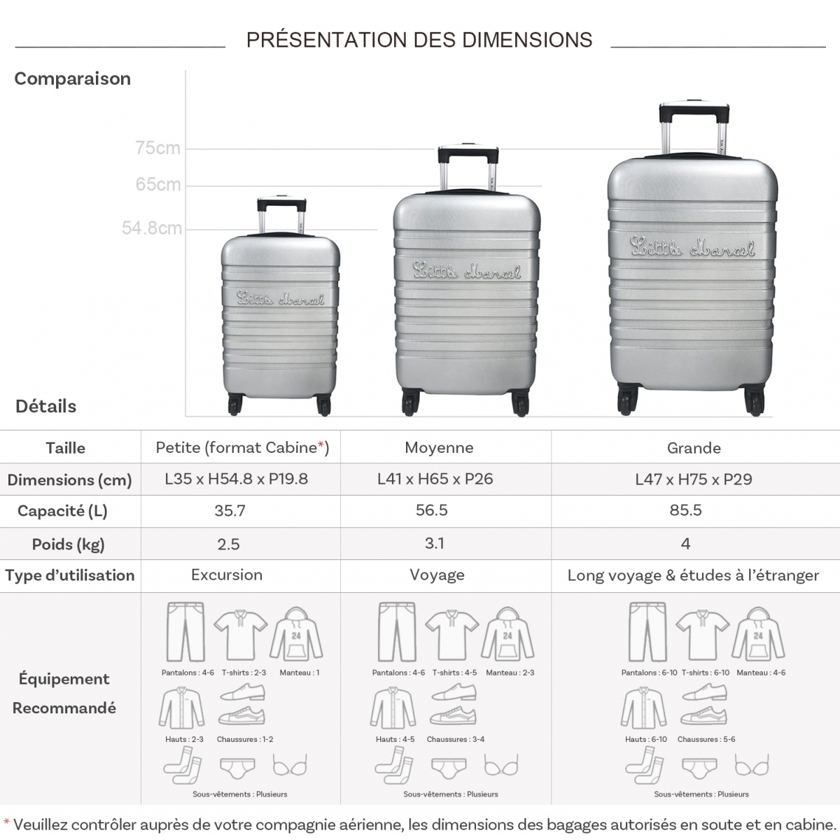 Les dimensions indiquées sont les dimensions extérieures des bagages, comprenant poignées, roulettes, pieds, poches latérales et autres éléments extérieurs.