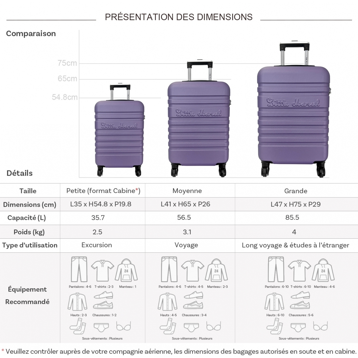 Les dimensions indiquées sont les dimensions extérieures des bagages, comprenant poignées, roulettes, pieds, poches latérales et autres éléments extérieurs.
