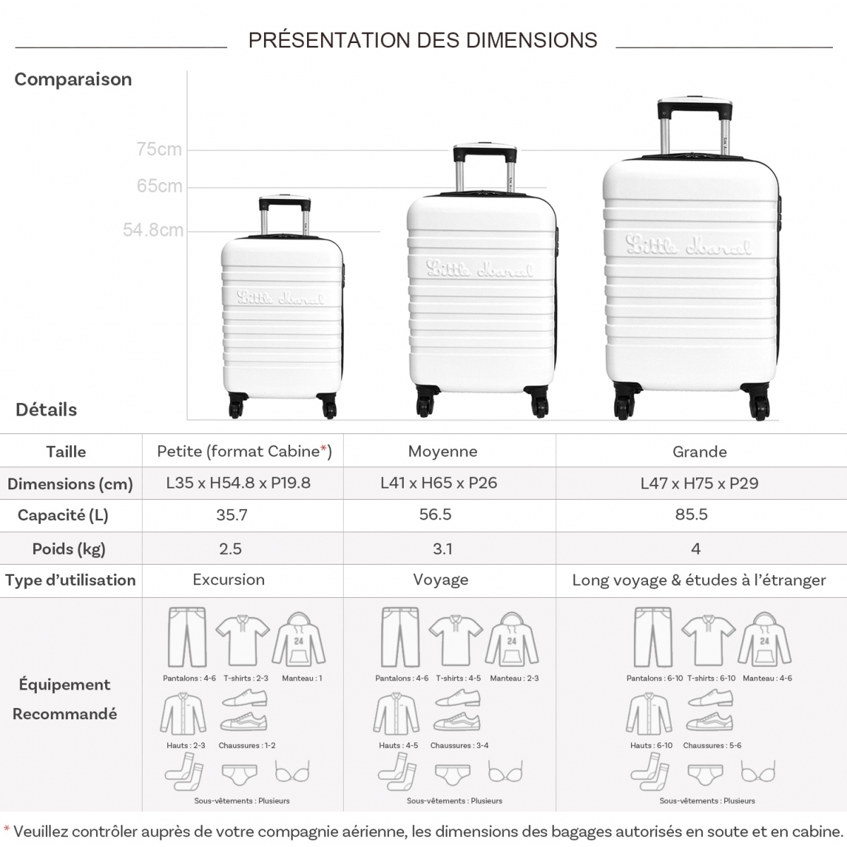 Les dimensions indiquées sont les dimensions extérieures des bagages, comprenant poignées, roulettes, pieds, poches latérales et autres éléments extérieurs.