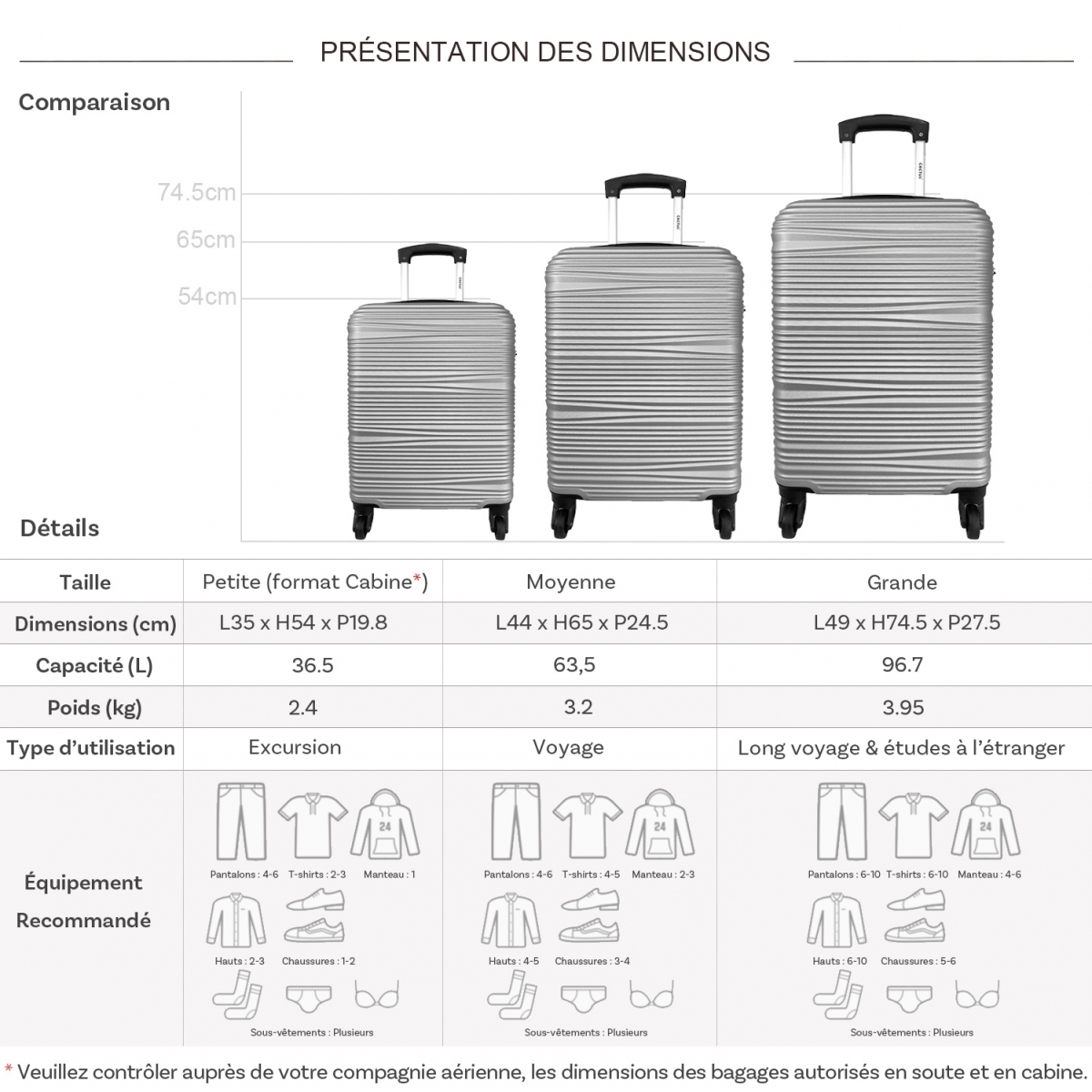 Les dimensions indiquées sont les dimensions extérieures des bagages, comprenant poignées, roulettes, pieds, poches latérales et autres éléments extérieurs.