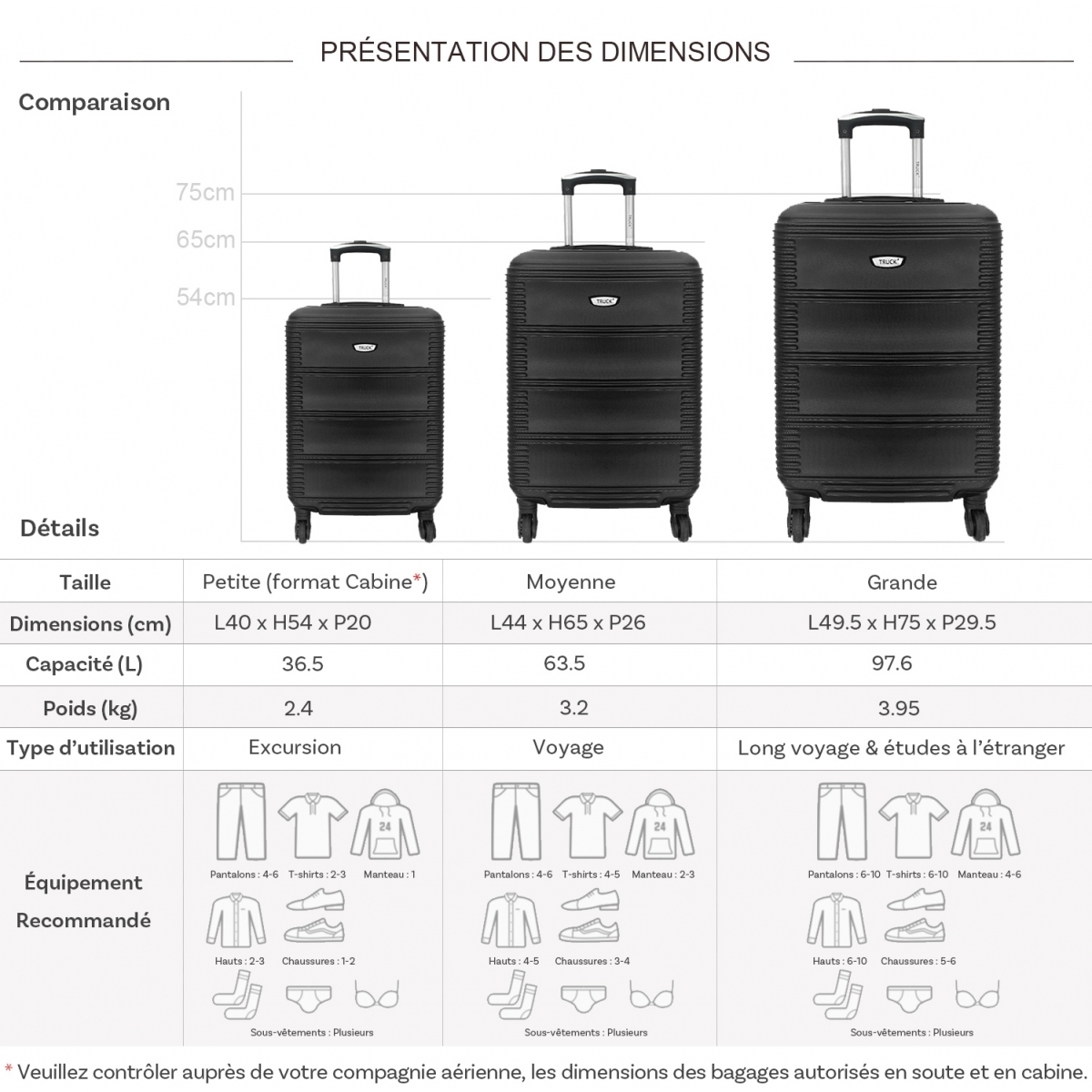 Les dimensions indiquées sont les dimensions extérieures des bagages, comprenant poignées, roulettes, pieds, poches latérales et autres éléments extérieurs.