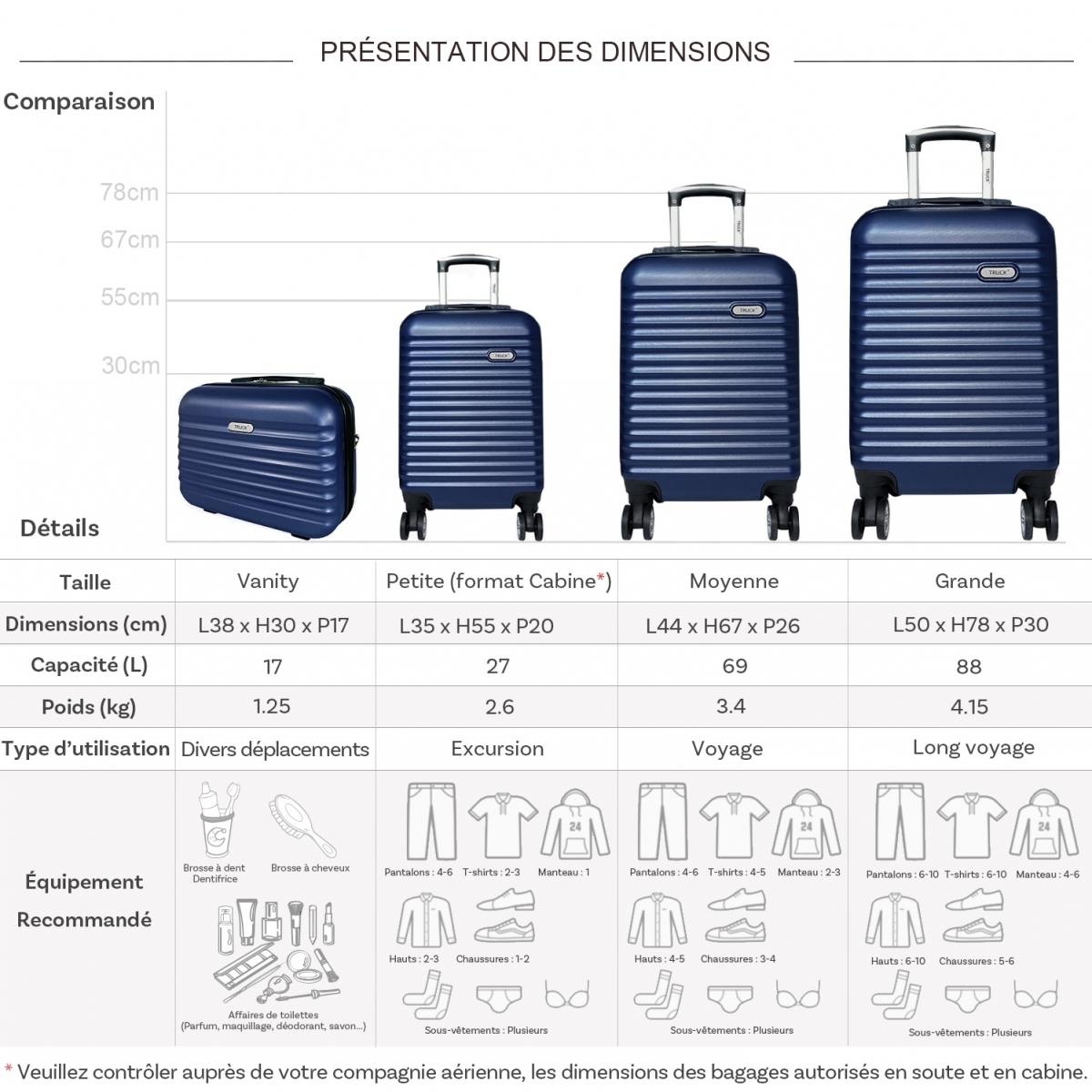 Les dimensions indiquées sont les dimensions extérieures des bagages, comprenant poignées, roulettes, pieds, poches latérales et autres éléments extérieurs.