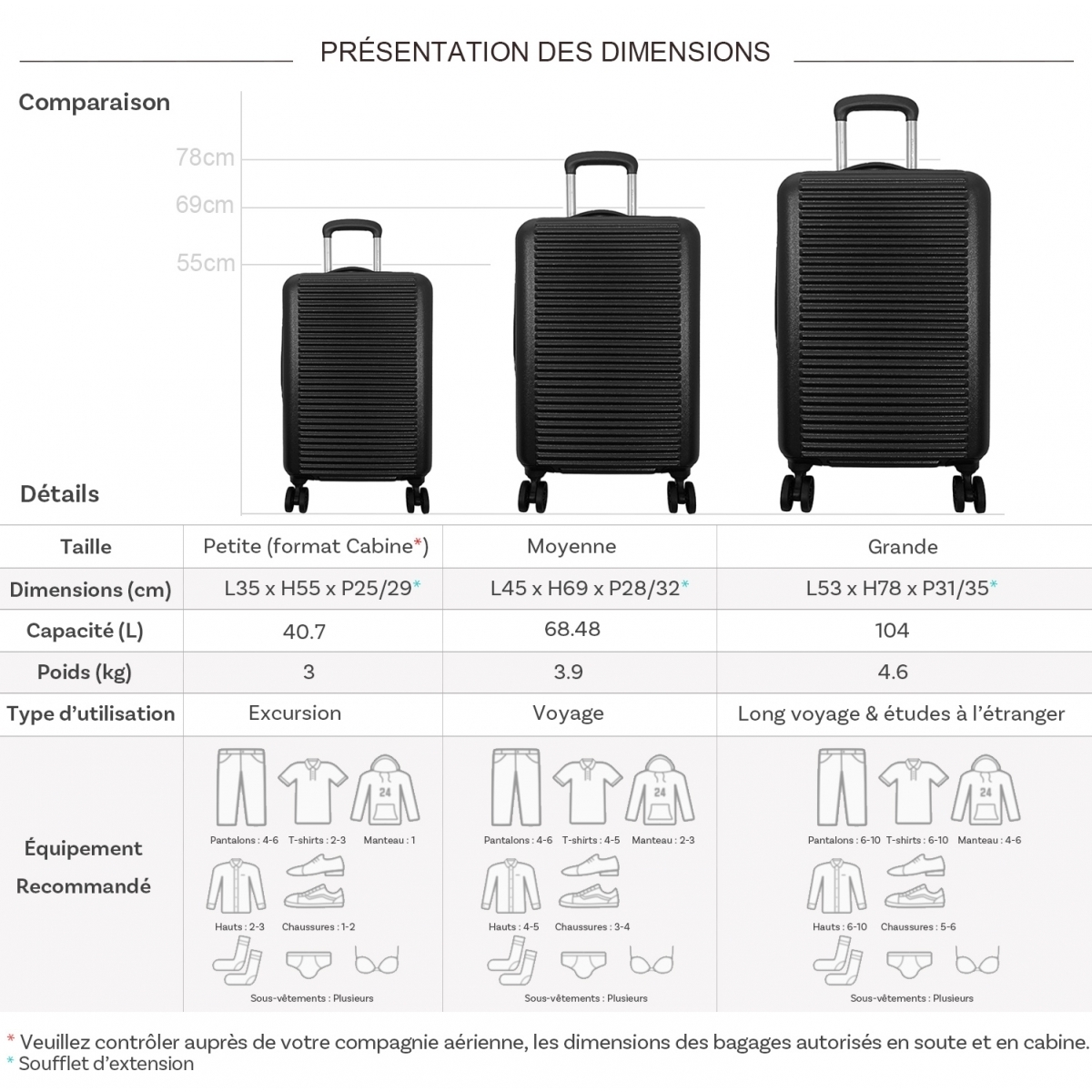 Les dimensions indiquées sont les dimensions extérieures des bagages, comprenant poignées, roulettes, pieds, poches latérales et autres éléments extérieurs.